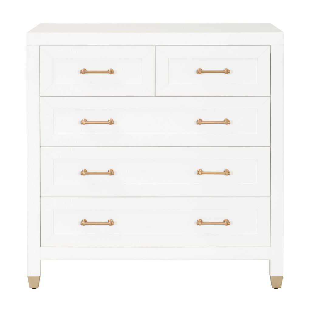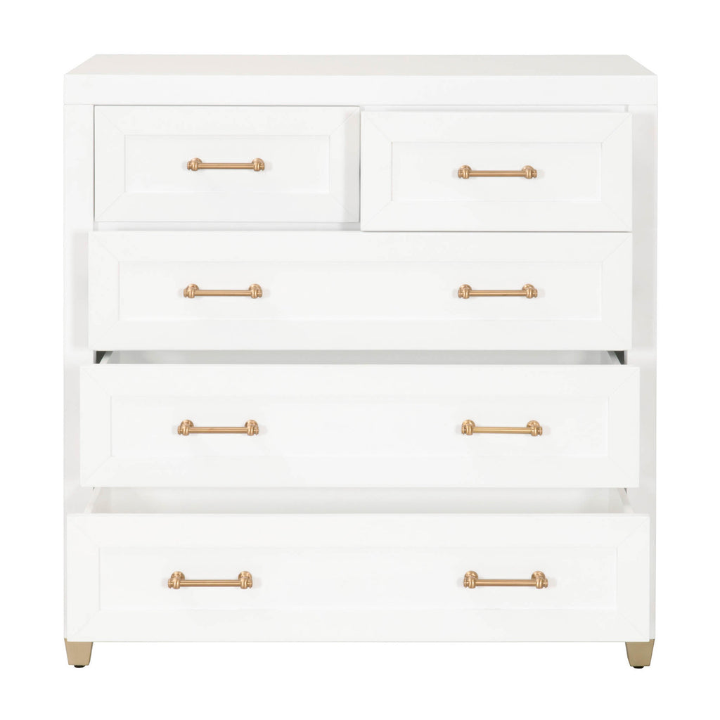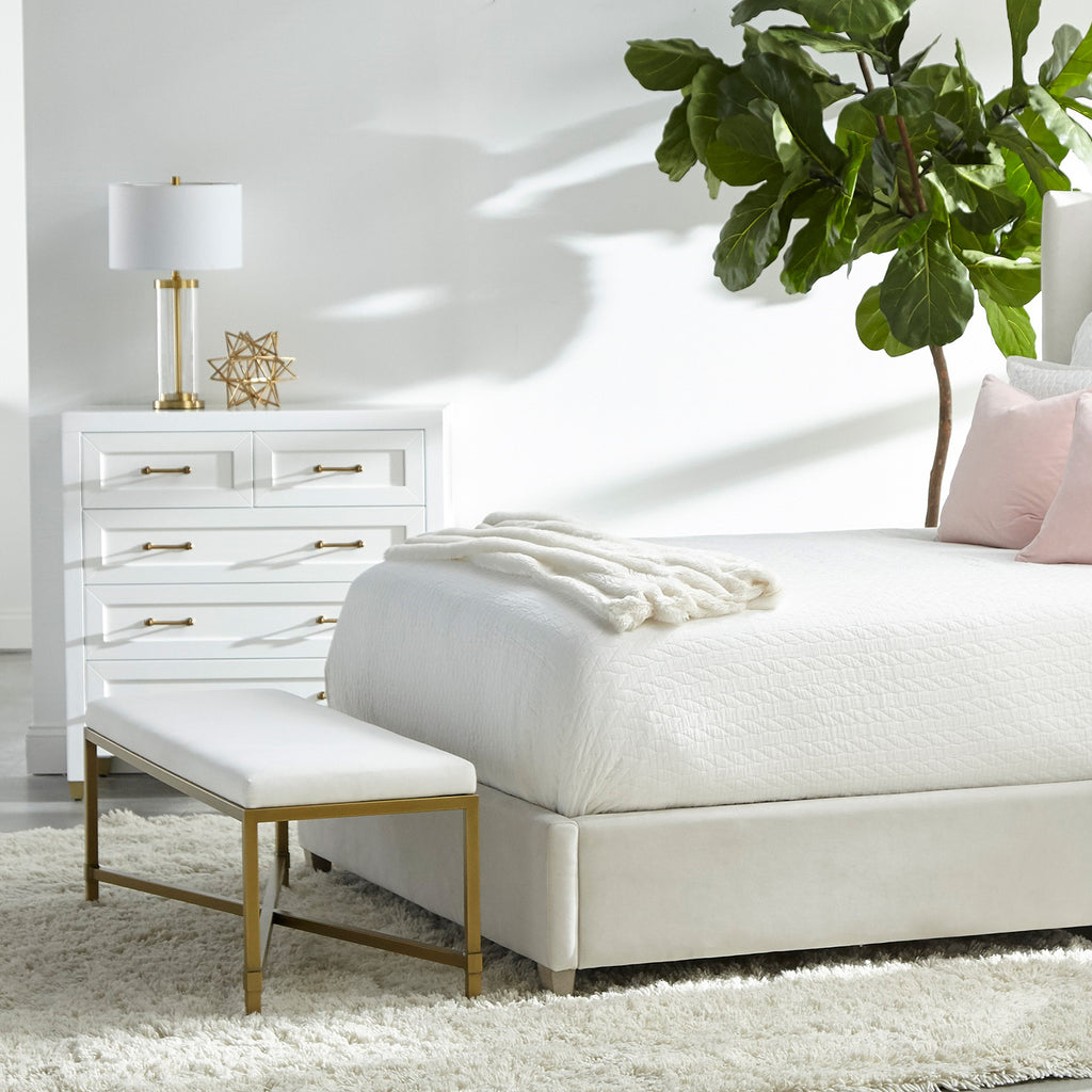 A sophisticated double dresser with a modern flare, the Essentials for Living Stella double dresser is constructed with 6 large storage drawers, this matte white dresser has plenty of space to store clothing and display pictures, perfume bottles or a television on top. It is accented with brushed brass pull handles and hardware, giving this nightstand a transitional look that will be a great addition to your bedroom.