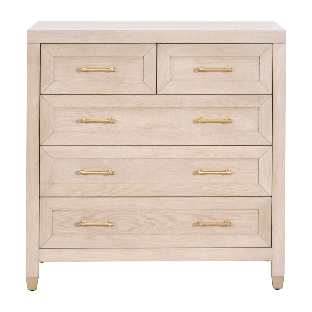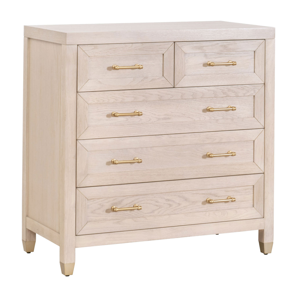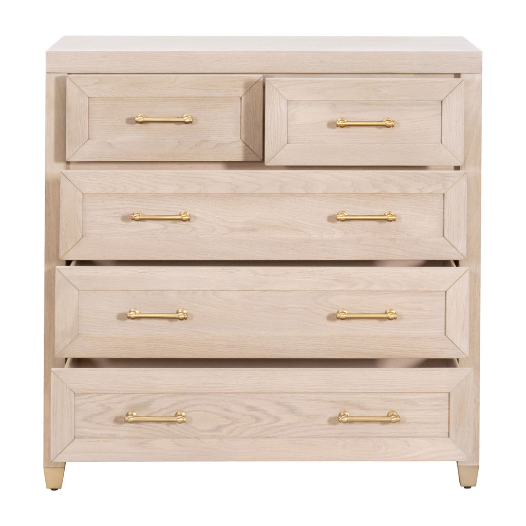 A sophisticated double dresser with a modern flare, the Essentials for Living Stella double dresser is constructed with 6 large storage drawers, this matte white dresser has plenty of space to store clothing and display pictures, perfume bottles or a television on top. It is accented with brushed brass pull handles and hardware, giving this nightstand a transitional look that will be a great addition to your bedroom.