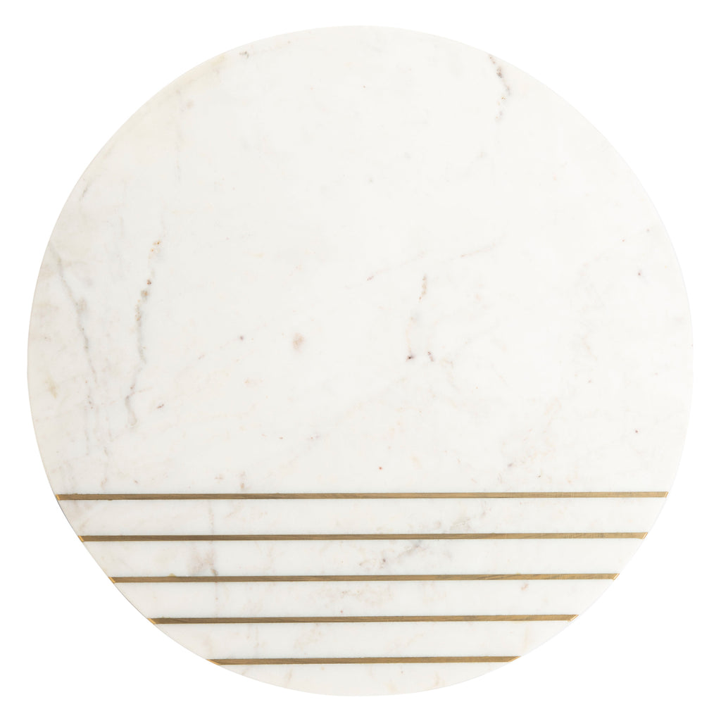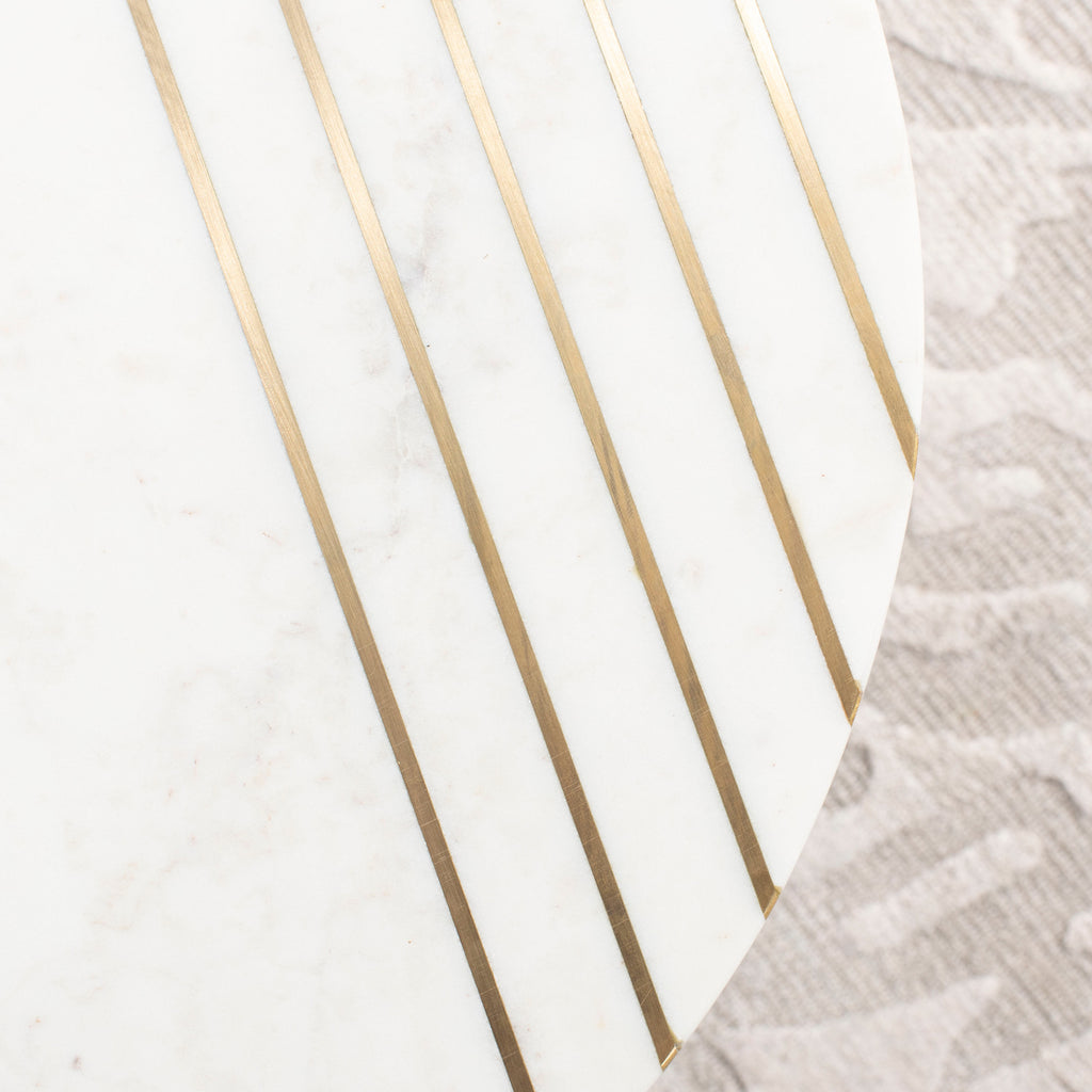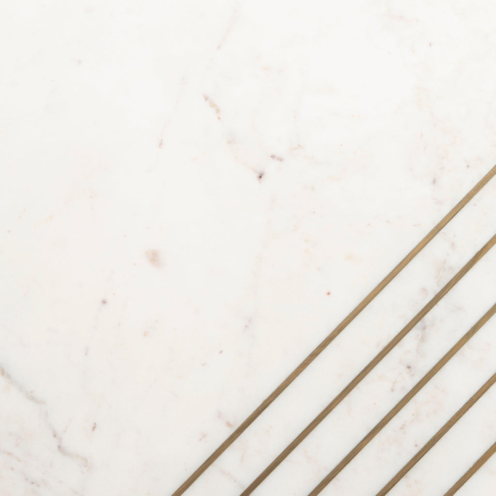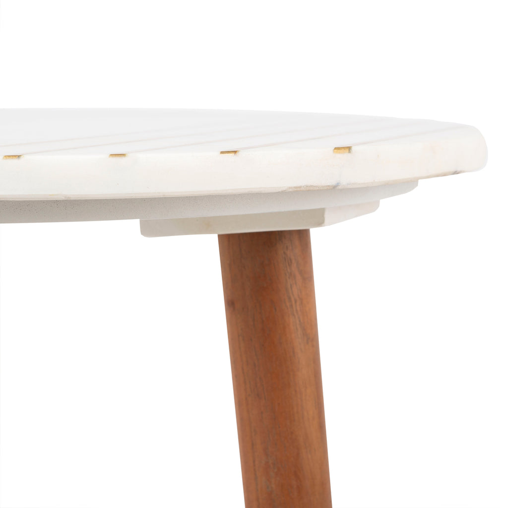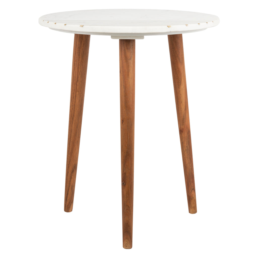 A modern marvel, this round marble Estill accent table updates any living room or bedroom. Designed to highlight its contemporary blend of materials, a sculpted design showcases its white marble top and its natural wood legs features deluxe retro gold caps.