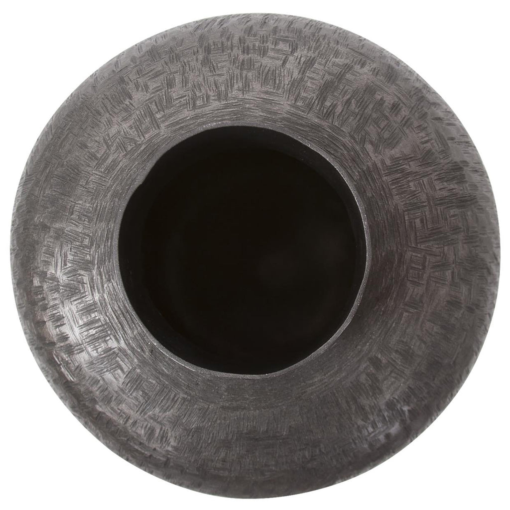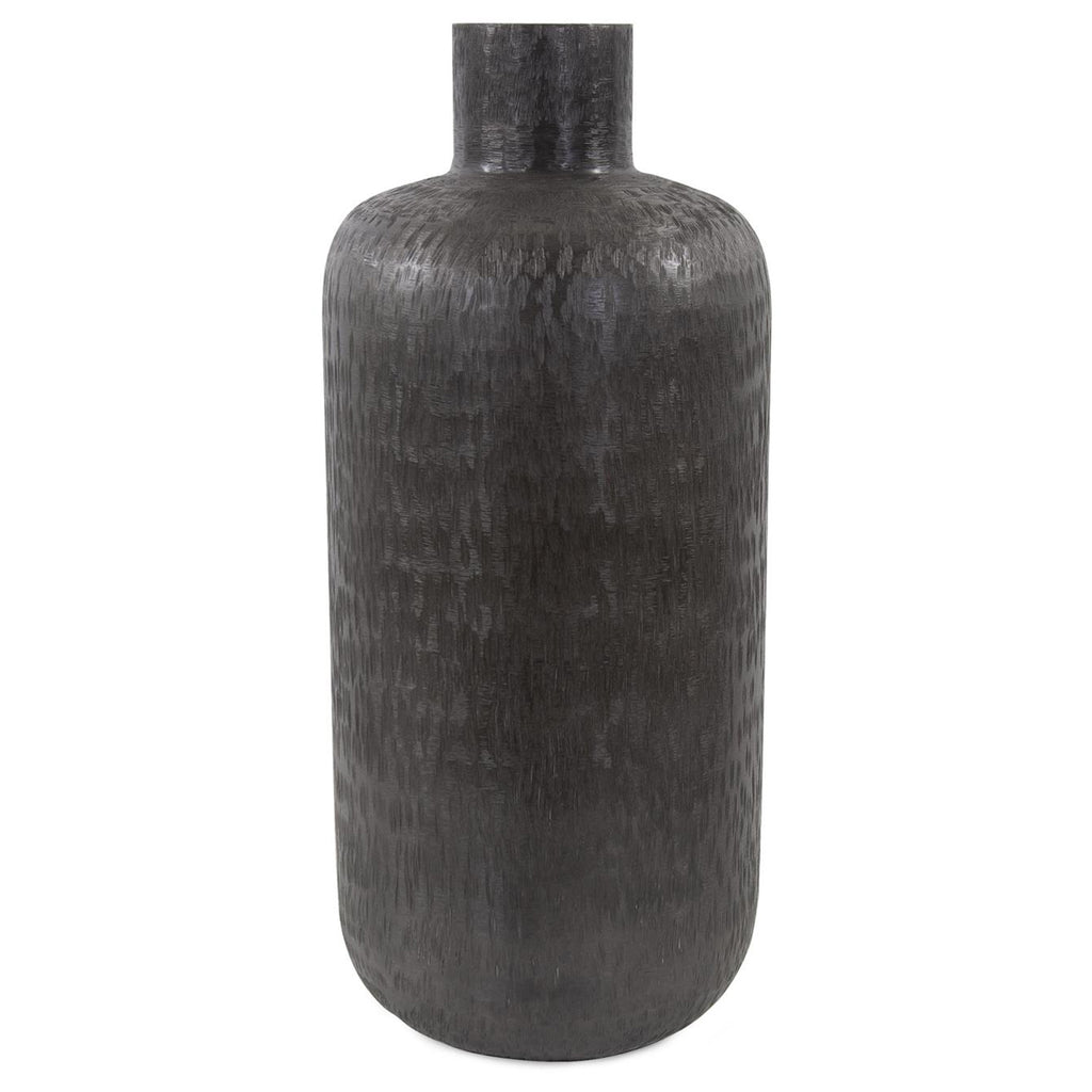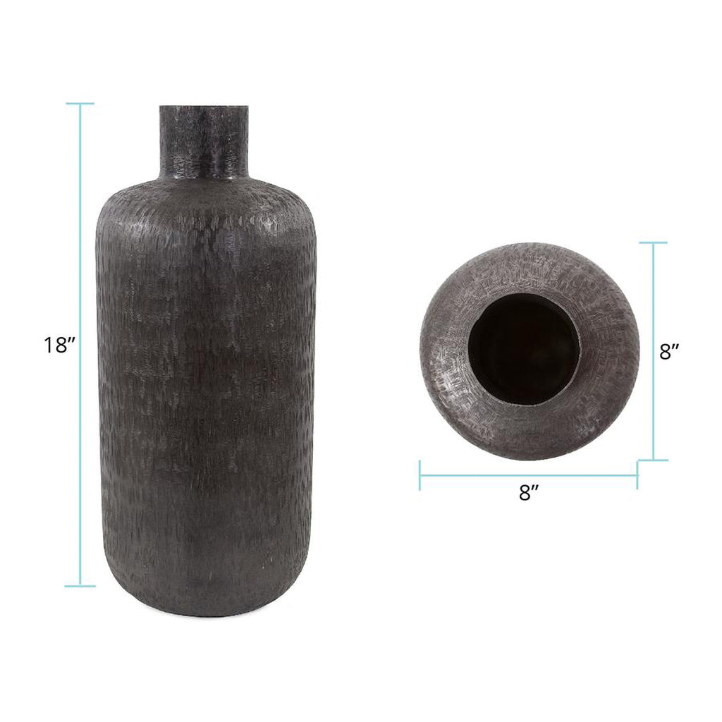 Beautifully forged and crafted by hand, the intricate etched crossway pattern helps to bring each shape to life with added dimension and texture. The short neck medium bottle vase in a rich charcoal gray finish makes a great accent piece all alone or filled with a few artificial sprigs to lighten up a room.