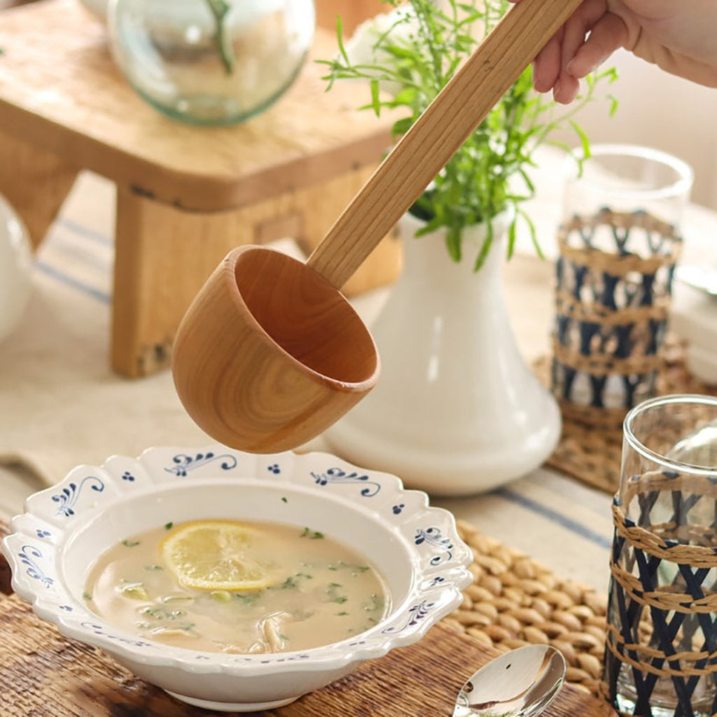 This large wooden ladle is the perfect addition to your assortment of kitchen tools. Designed for scooping soup, sauces, and batter. Each ladle shows natural variations in wood grain, making each tool unique.
