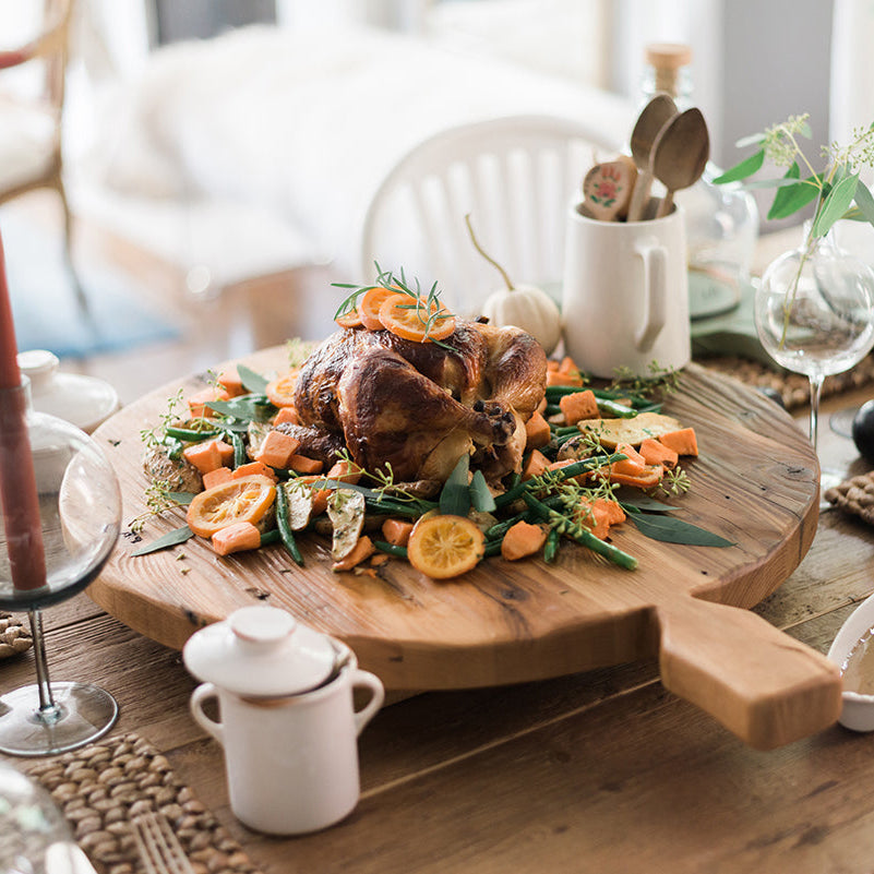 With the rise of the popular trivets, we set out to create a larger version that could be used as a wooden serving plate on your countertop or table. The Footed Serving Board combines all of the fantastic qualities of our classic trivets, with the addition of a handle and feet to create a serving tray for all occasions. The opportunities are endless when it comes to using this wood board. This decorative piece is hand-crafted from reclaimed wood. Due to the nature of the found beams, no piece will be perfectly identical and will contain varying crevices and splits within the wood, embracing its organic beauty even further. etúHOME’s serving boards are intended for serving only and should not be used for cutting or chopping. To protect and preserve the integrity and longevity of the piece, we recommend using a barrier such as parchment paper, a plate or a bowl for non-dry and hot ingredients.