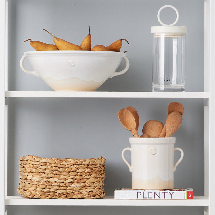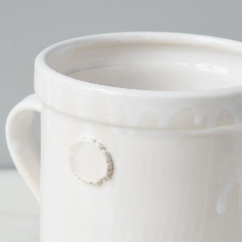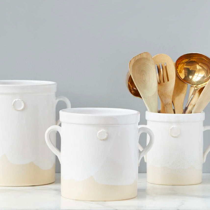 • The utensil crocks were inspired by an Italian staple, the olive jar. The ceramic pots come in three sizes, small, medium and large, each exerting the same effortless beauty as the next. With a clay seal on each side and sturdy handles, the jar is the ideal utensil holder next to your stove or as a flower vase on your counter.