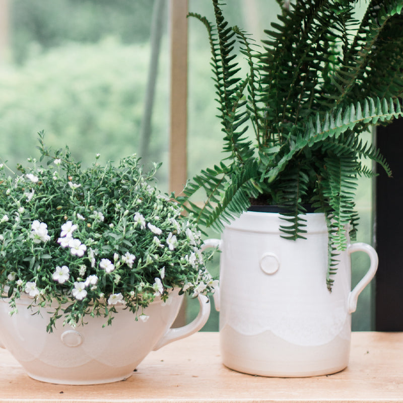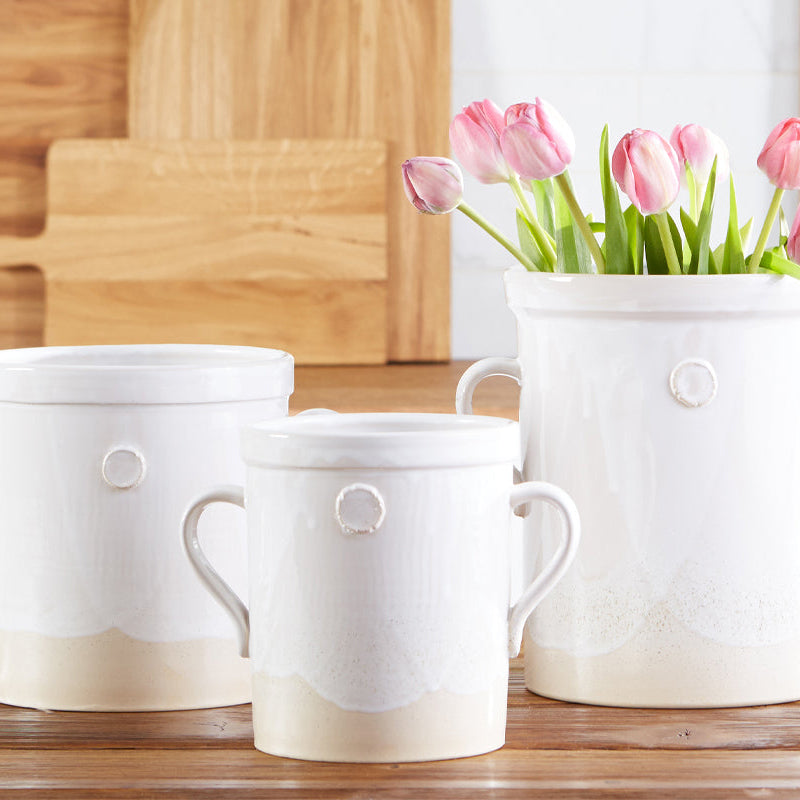 Handcrafted from white European clay, the Handthrown Pottery Collection is created by European artisans on an original potter’s wheel. The pieces are inspired from classic European kitchens, mixing traditional designs with contemporary style. While each item is different and will vary due to the handcrafted technique used to create them, each piece boasts a unique lush glaze to enhance authenticity. The raw clay is left untouched on the bottom, while the top portion is dipped in a warm, white lead-free, non-toxic glaze for the perfect mix of traditional design and contemporary style.