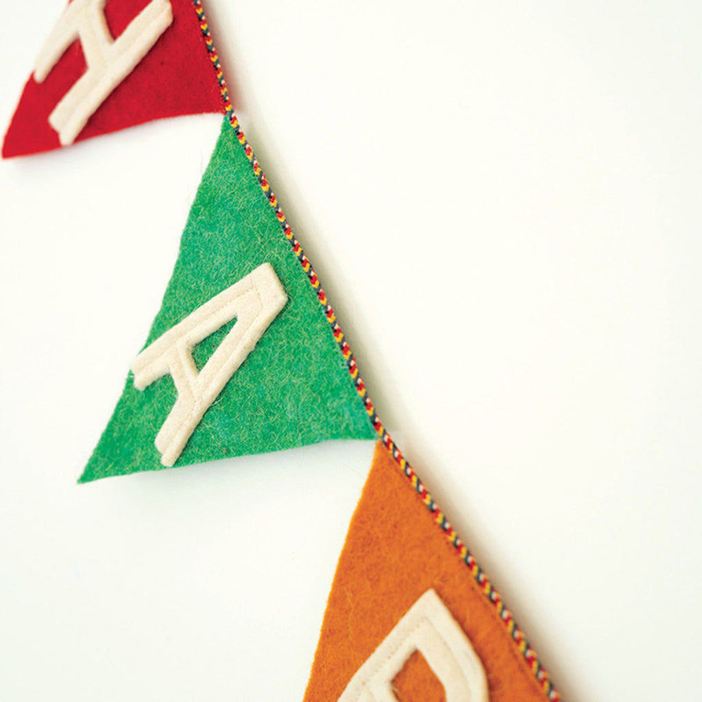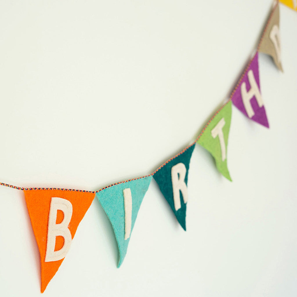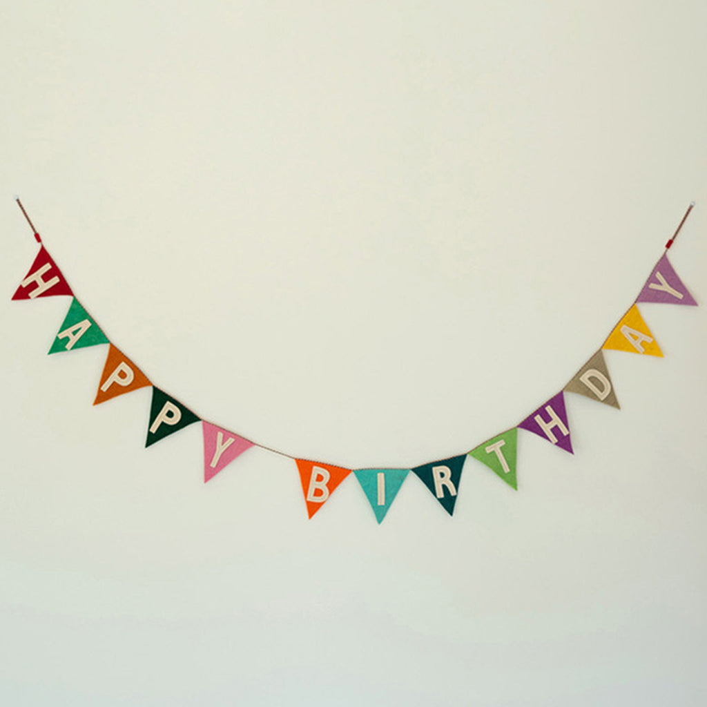 Proclaim your good wishes to the birthday person with this colorful felt flag garland. It spells out Happy Birthday in several brightly colored felt flags. This garland can be hung or draped for any birthday party.