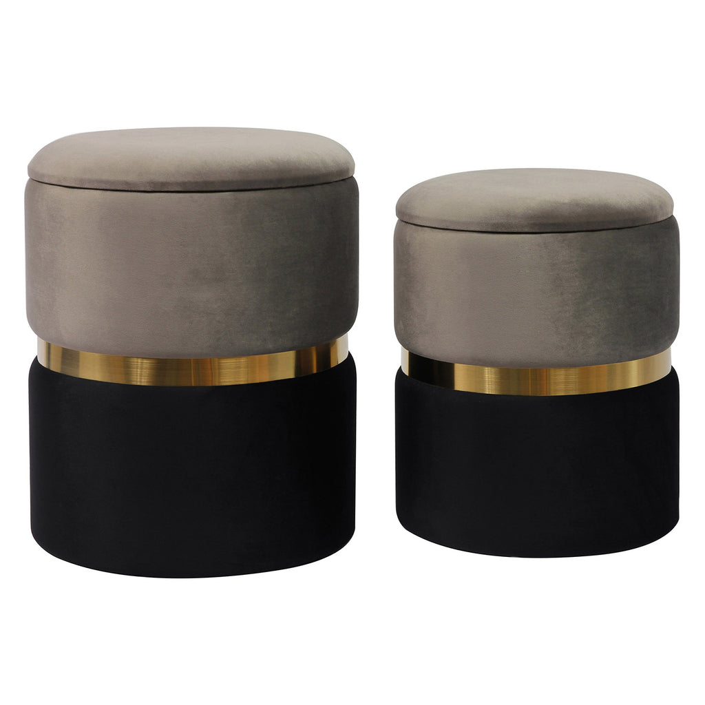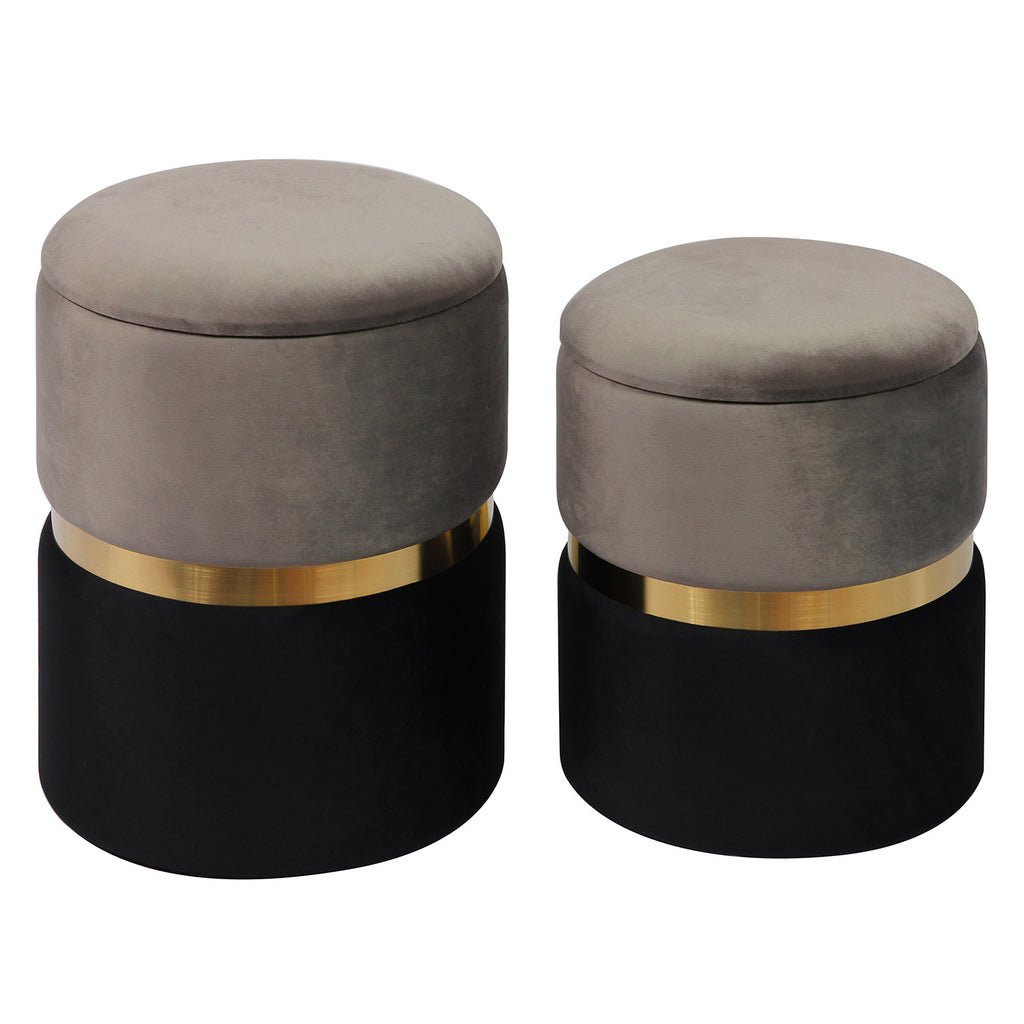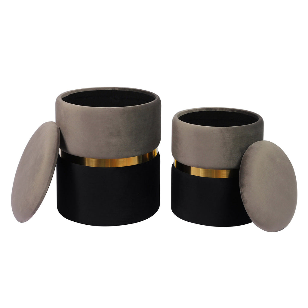 Featuring soft velvet upholstery punctuated by a contrasting gold band, the versatile Flint ottoman set can be used as footstools or extra seating. The tops of the ottomans also open to provide some much-needed storage space.