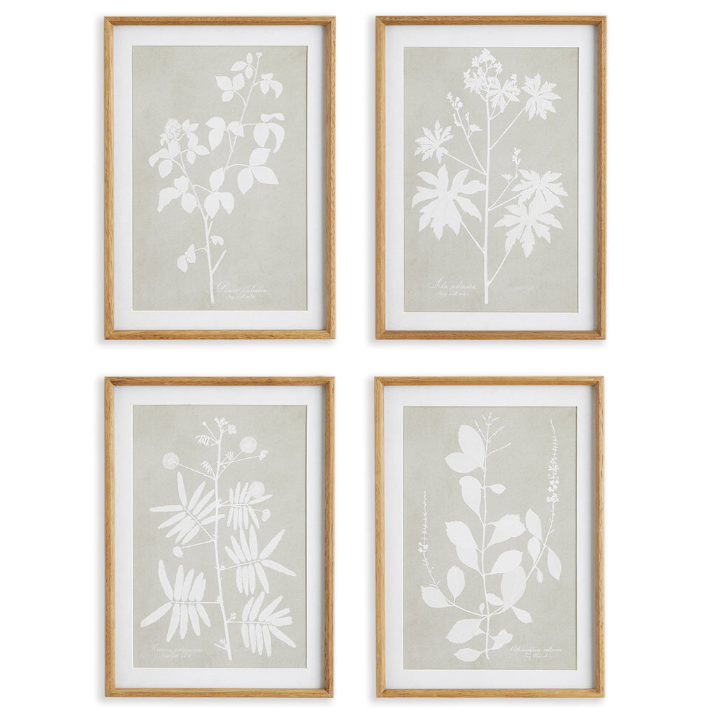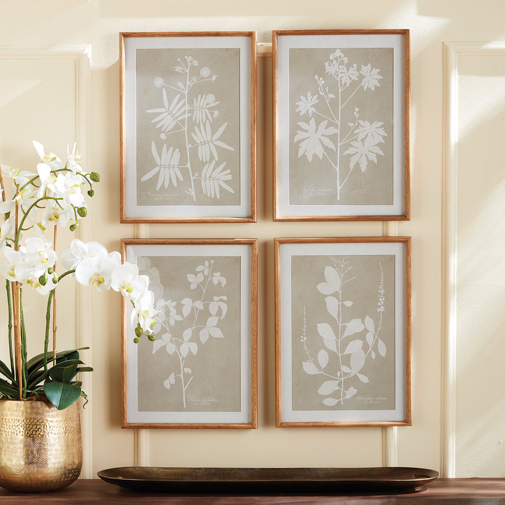 With a soft taupe background and silhouetted foliage forms, this simple composition of coordinating prints is a beautiful addition to any space. Finished off with beveled cardboard mats and warm wood frames, they are perfect for powder room, kitchen or den.