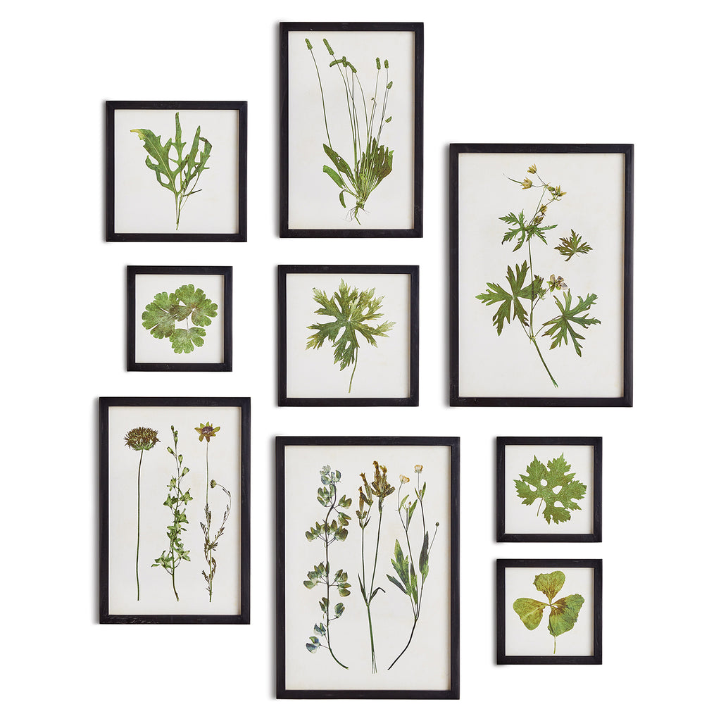 These traditional botanical foliage study prints are a study of foliage that's vibrant green, complemented with a black wood frame. This handsome set of nine was carefully curated to create a stunning salon style arrangement, but can also be split up into sets for smaller spaces. A stunning choice for home office or study.