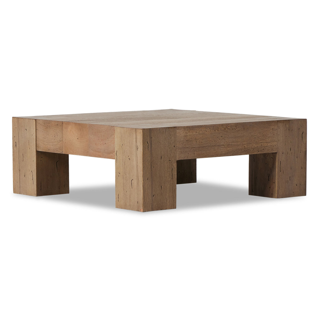Made from thick-cut oak veneer with a faux rustic finish made to emulate wormwood, this low, square-shaped coffee table features chunky squared legs and dovetail joinery detailing. Perfectly sized for smaller spaces.