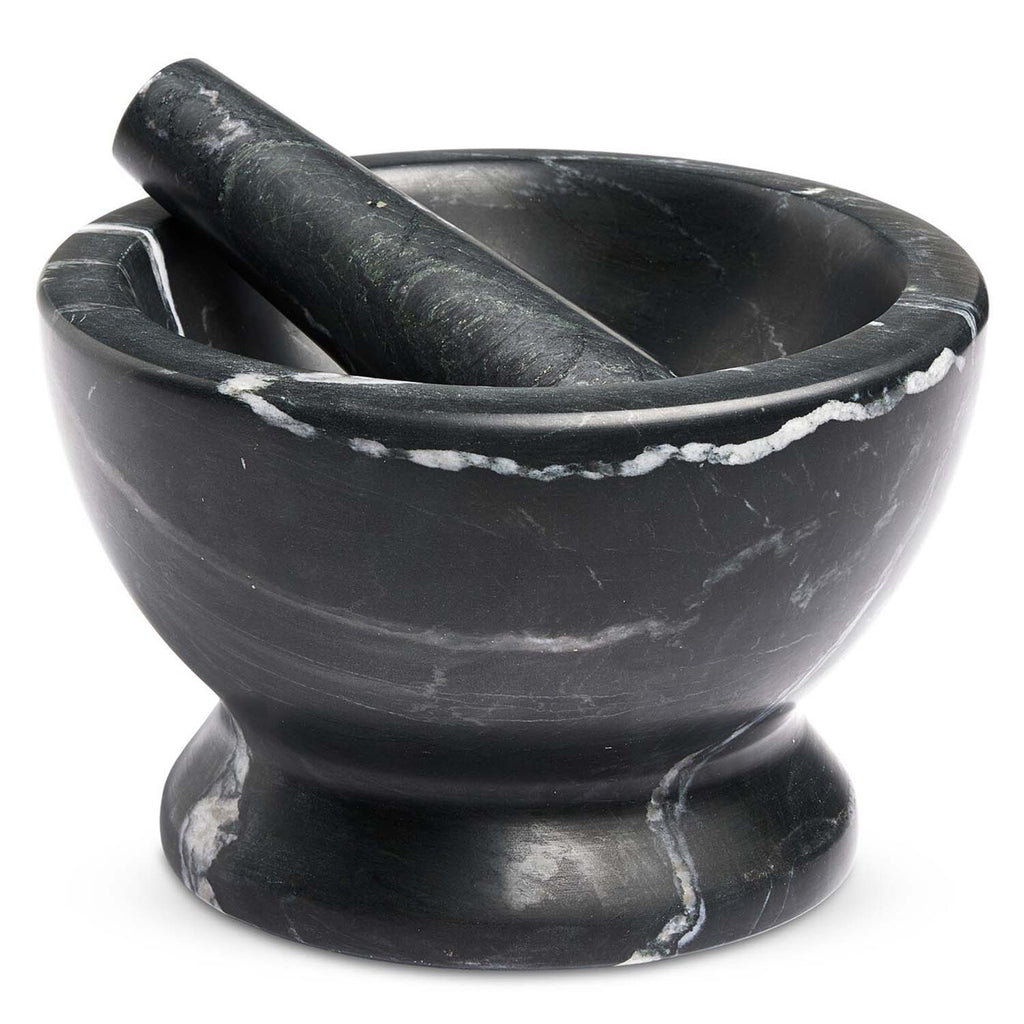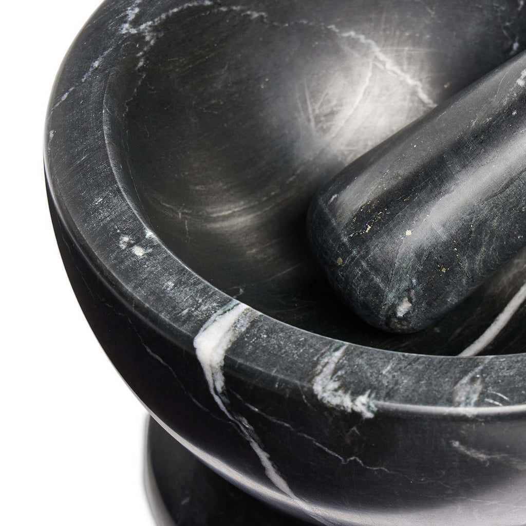 Sculpted black marble mortar and pestle with dramatic veining. Classic pedestal base and lipped handle honor traditional forms. A striking decorative piece for kitchen displays or countertops, not tested for food safety.