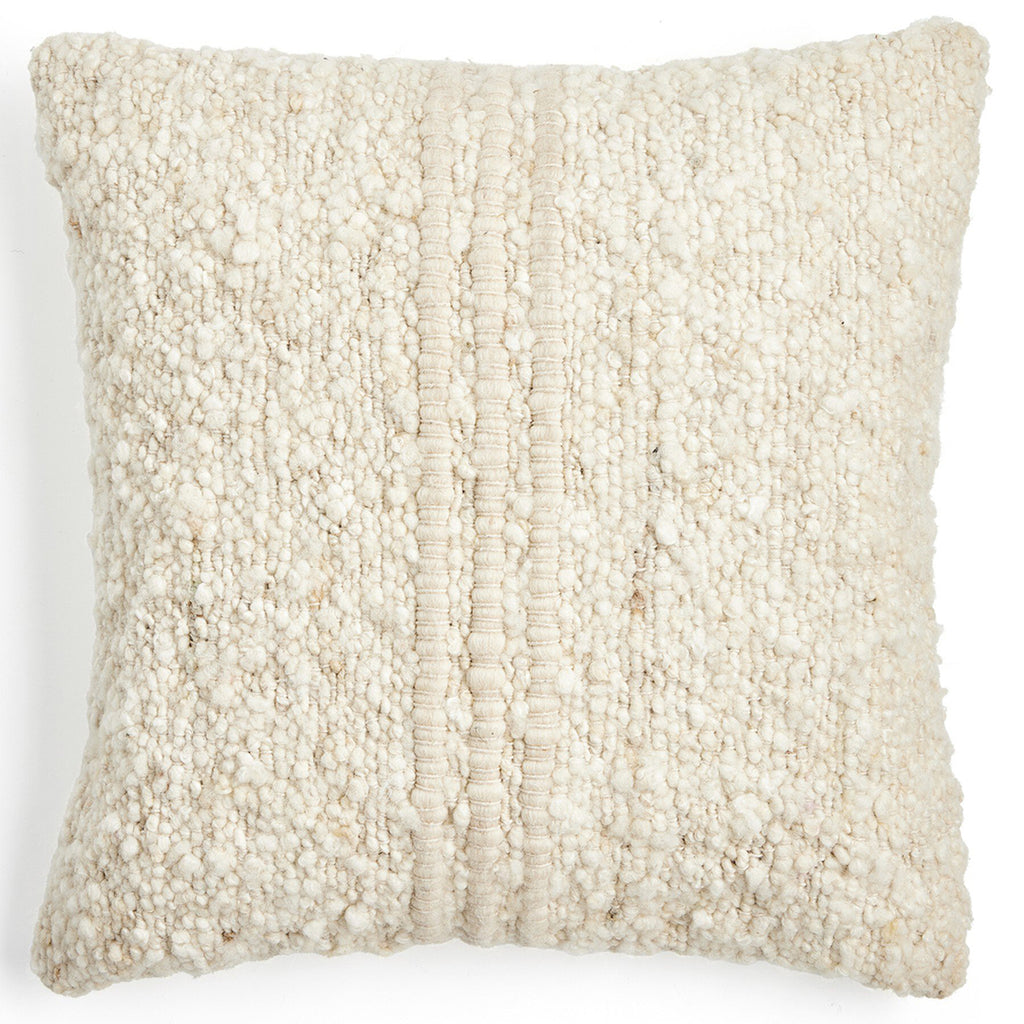 Textural wool with natural flecks weaves a monochromatic throw pillow, accented by three stitched center stripes. A neutral, dimensional solid.