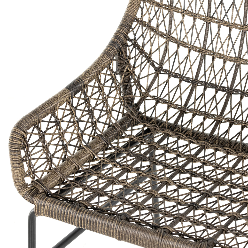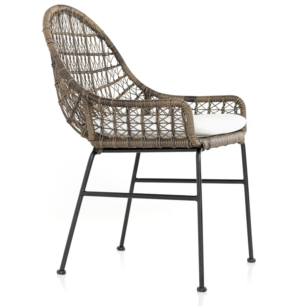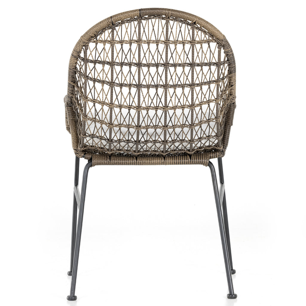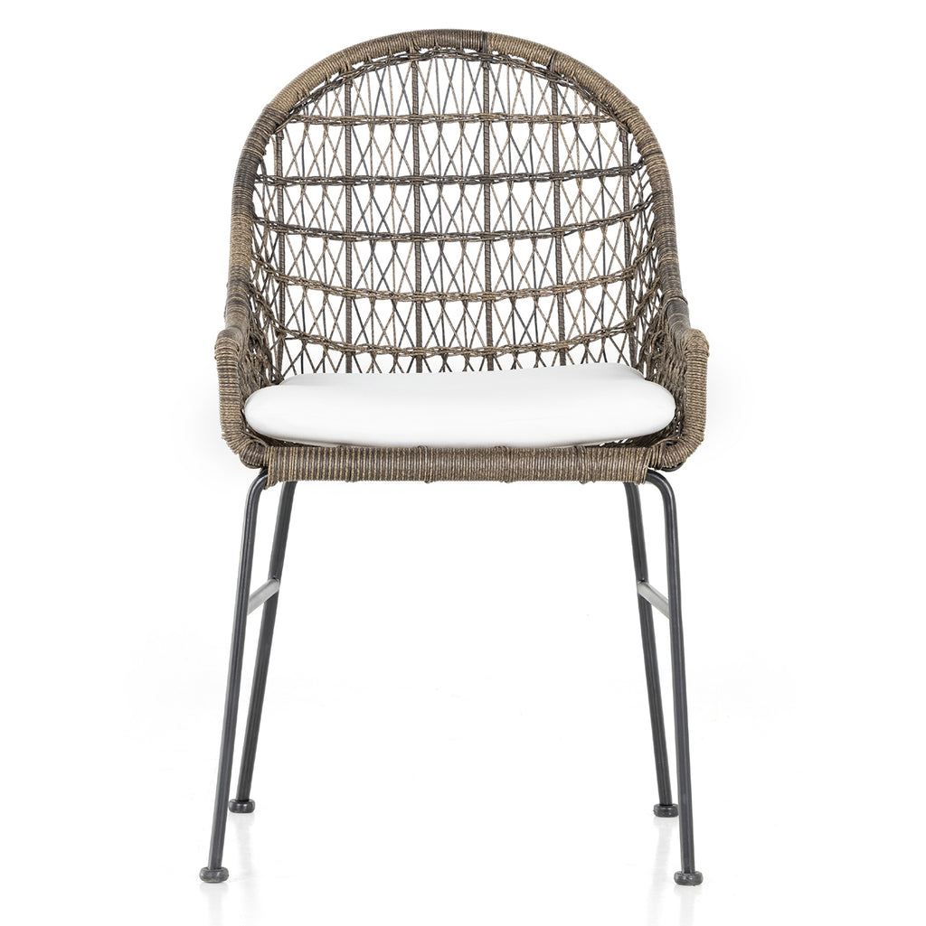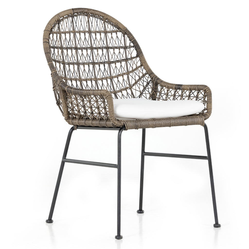 Clean, contemporary shaping and an updated weave transform all-weather wicker into something modern. This high-texture dining chair is supported by a contrasting black iron base, with a white seat cushion for comfort. Cover or store indoors during inclement weather and when not in use.