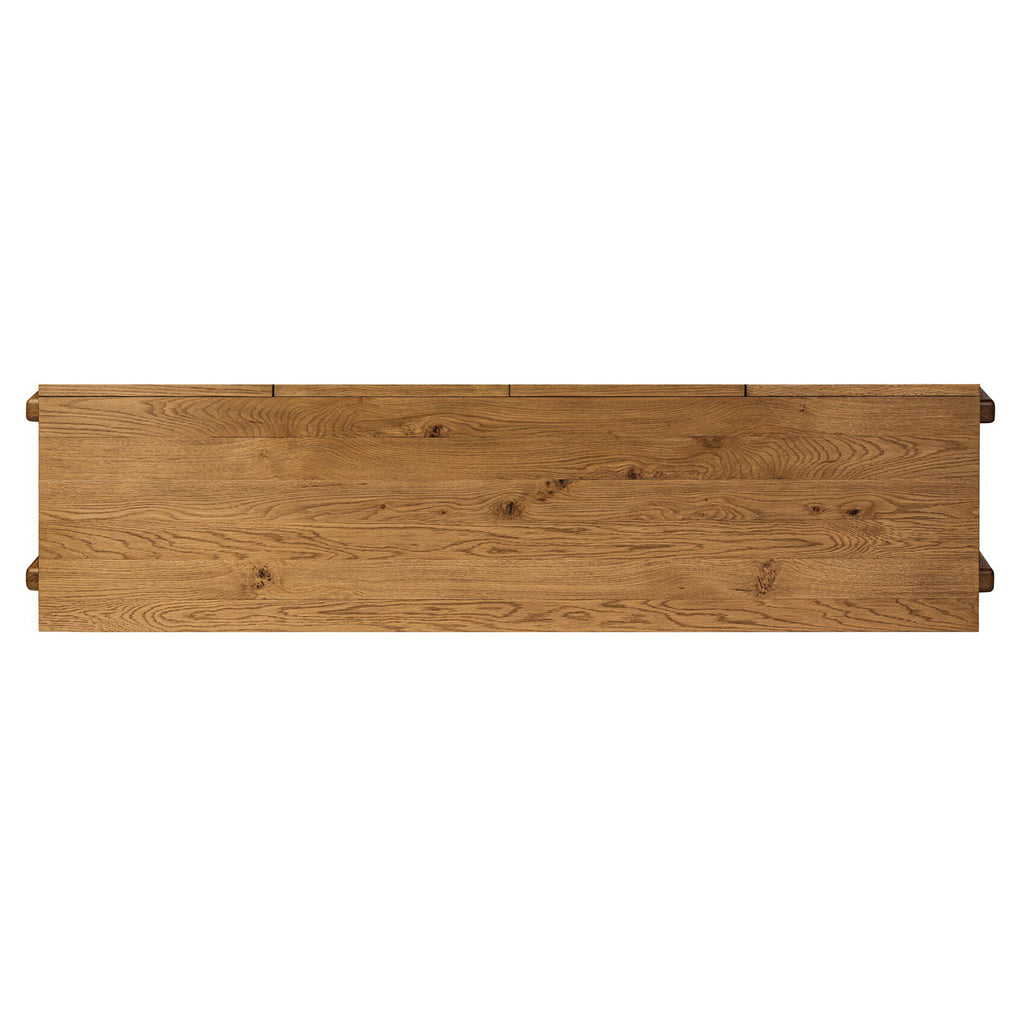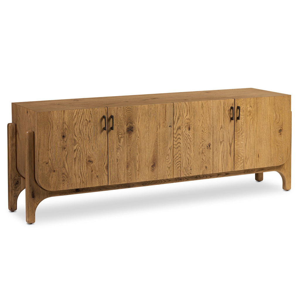 A curved cradle base brings an elevated, artisan look to this worn oak media console. Generous interior storage creates endless space for your media needs, with rear cutouts for cord management.