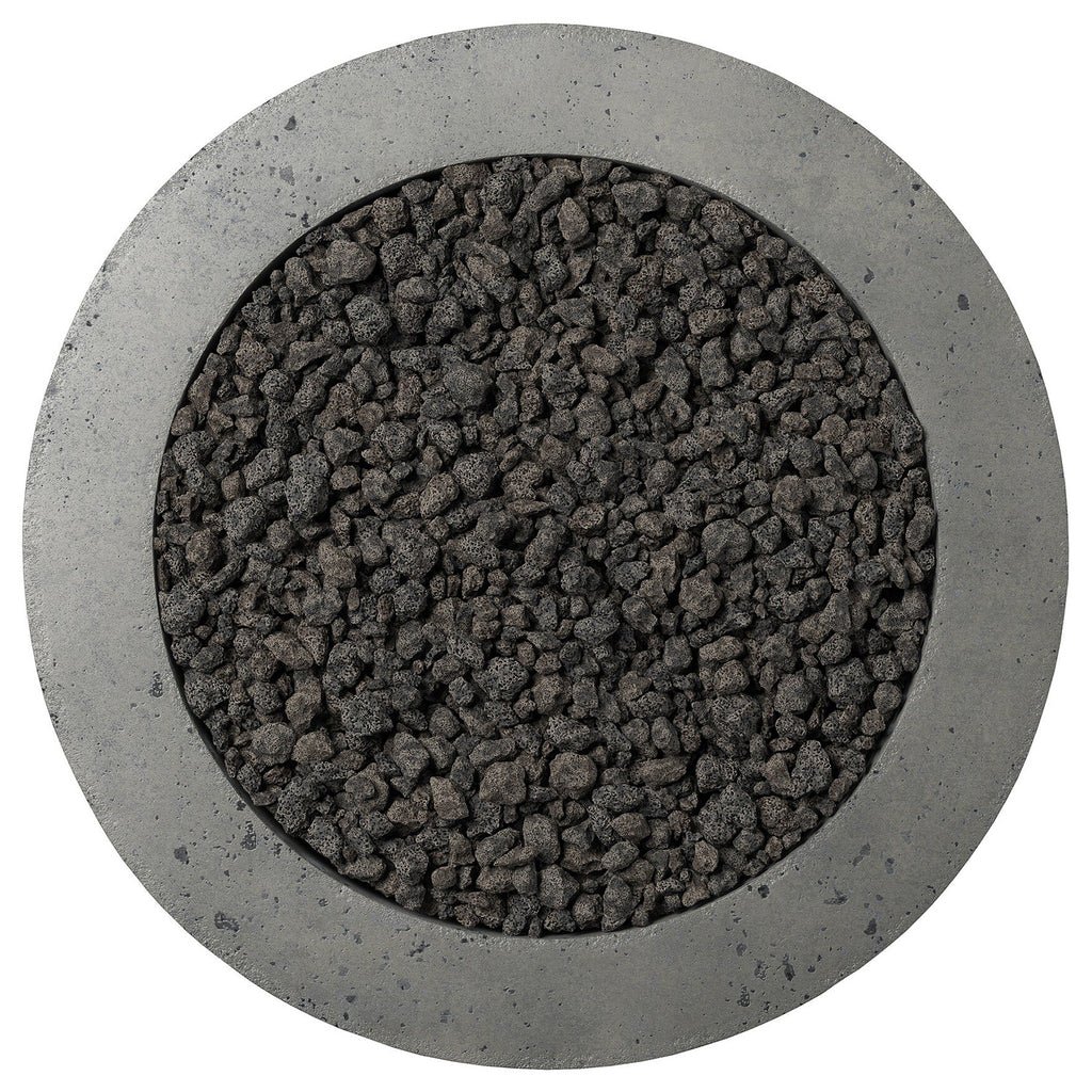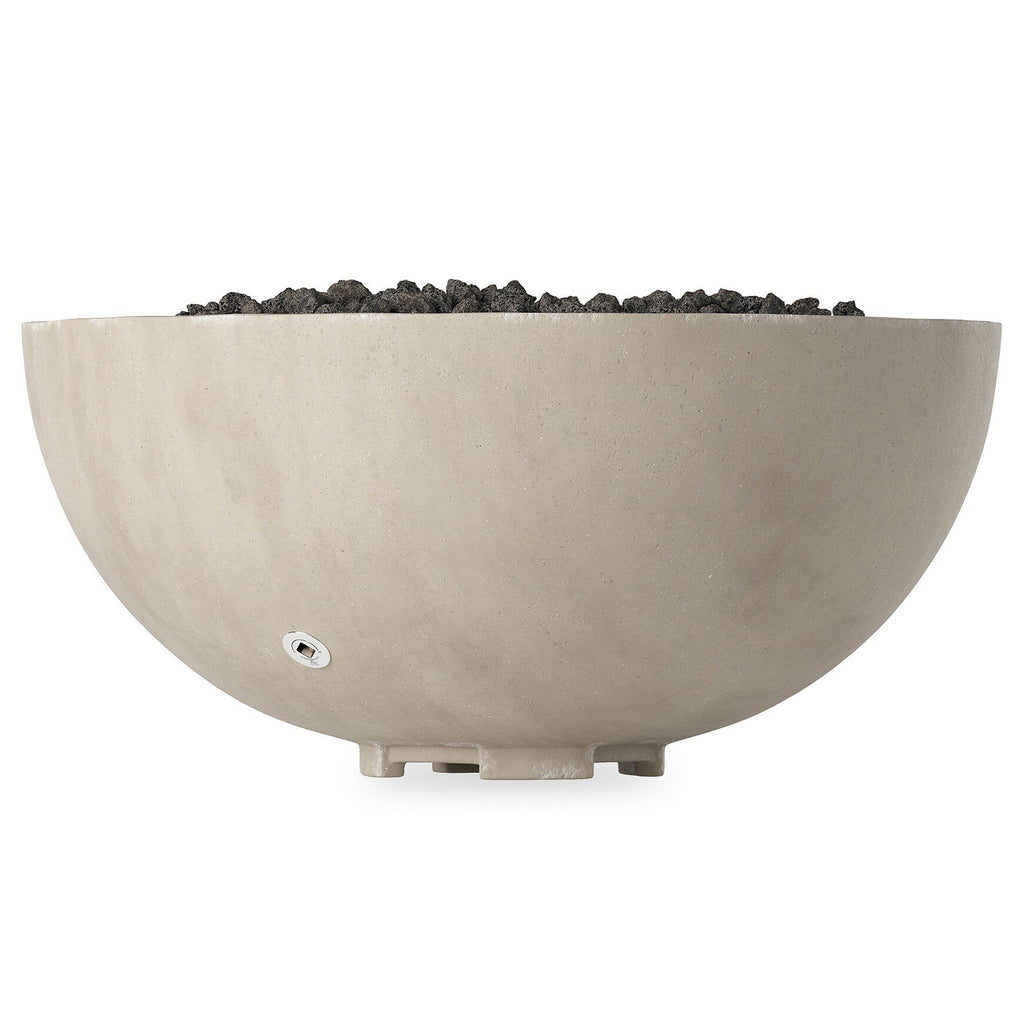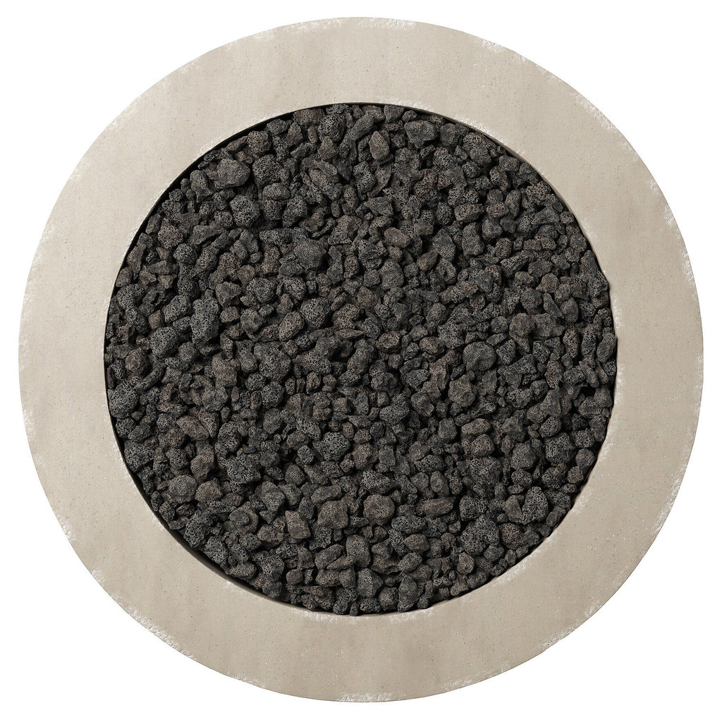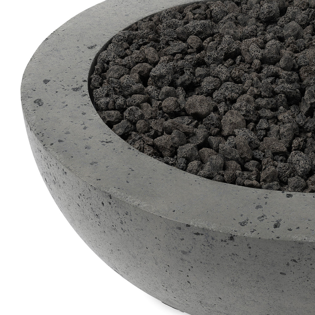 This outdoor fire table is a welcoming centerpiece designed for gathering. Made from glass-reinforced concrete, each piece is naturally finished with subtle tones of grey and cream. The bowl shape is completed with lavastones in the center, bringing together a bold, monochromatic look. Cover or store indoors during inclement weather and when not in use.