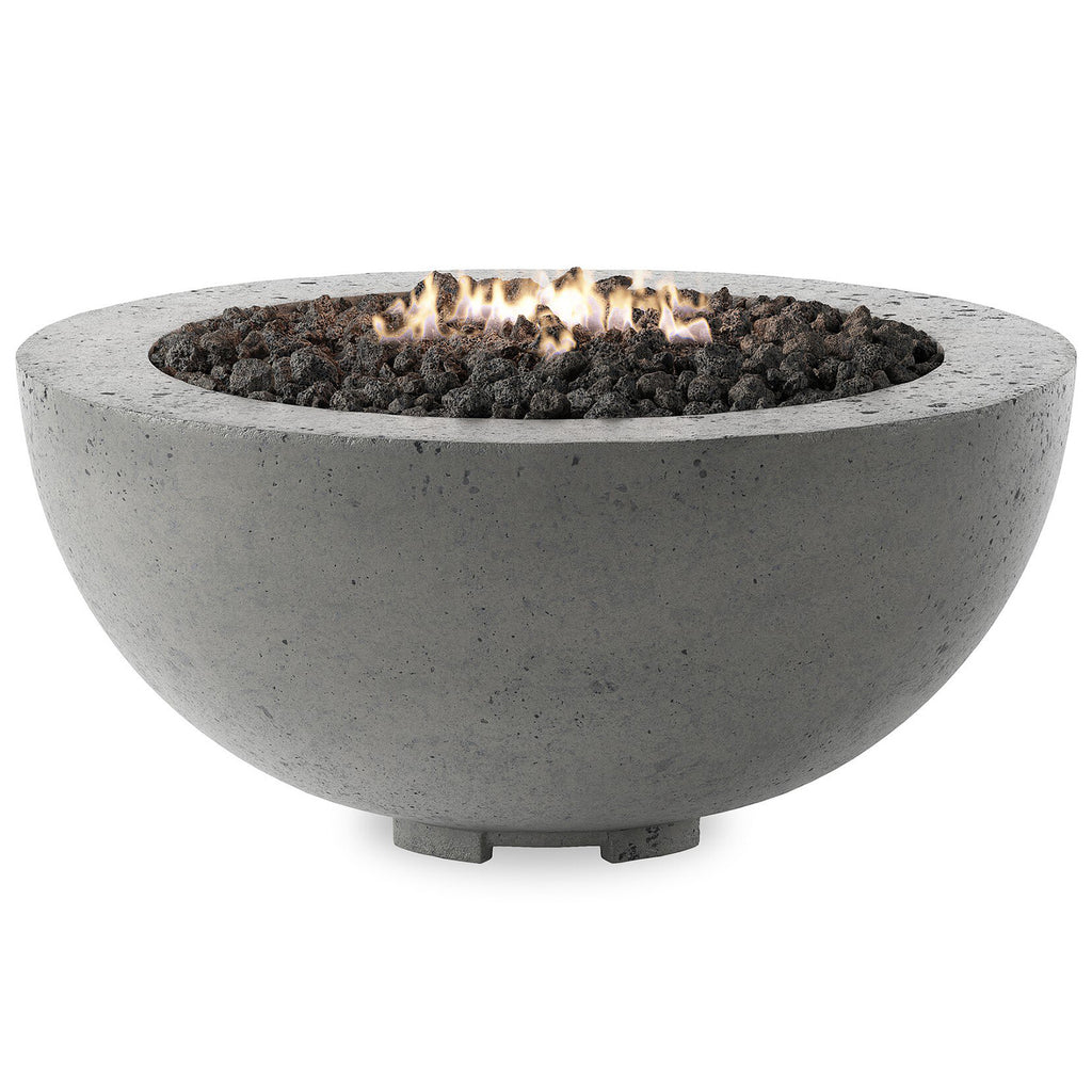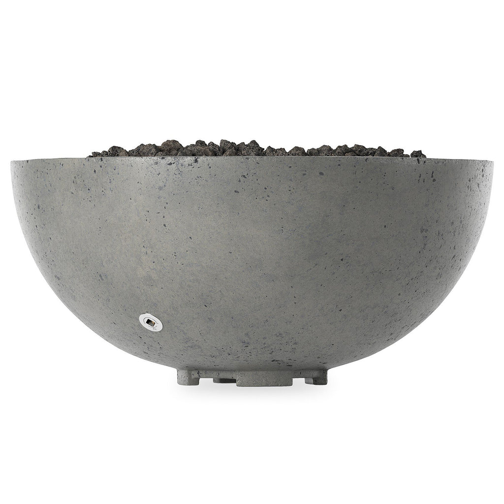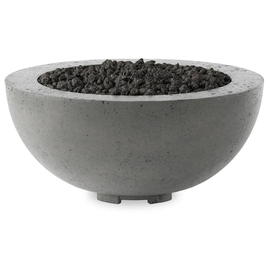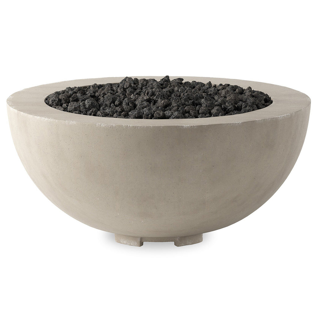 This outdoor fire table is a welcoming centerpiece designed for gathering. Made from glass-reinforced concrete, each piece is naturally finished with subtle tones of grey and cream. The bowl shape is completed with lavastones in the center, bringing together a bold, monochromatic look. Cover or store indoors during inclement weather and when not in use.