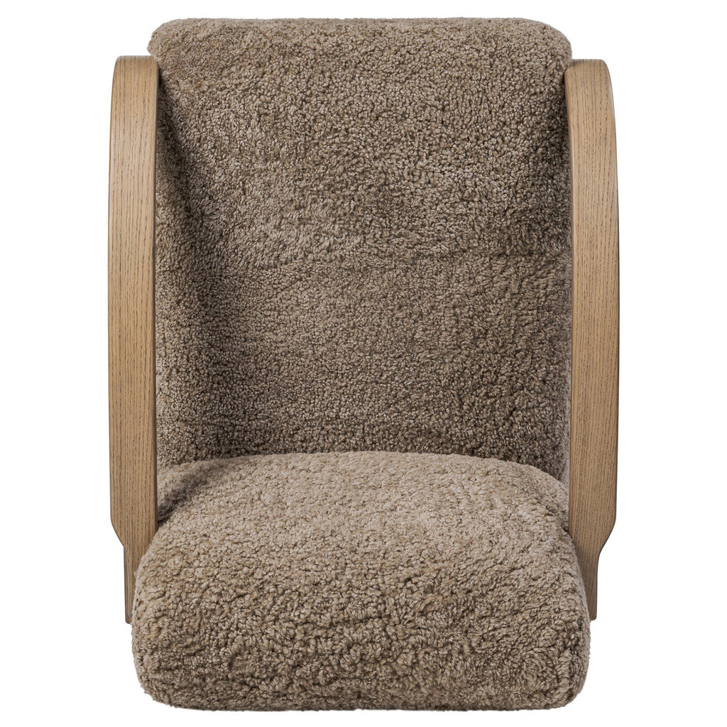 Soft texture and eye-catching contours fuse in this comfort-driven accent chair, pairing a low, luxurious shearling seat and dramatic bent wood frame.