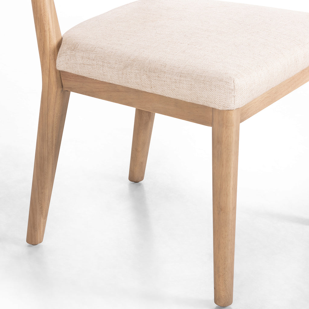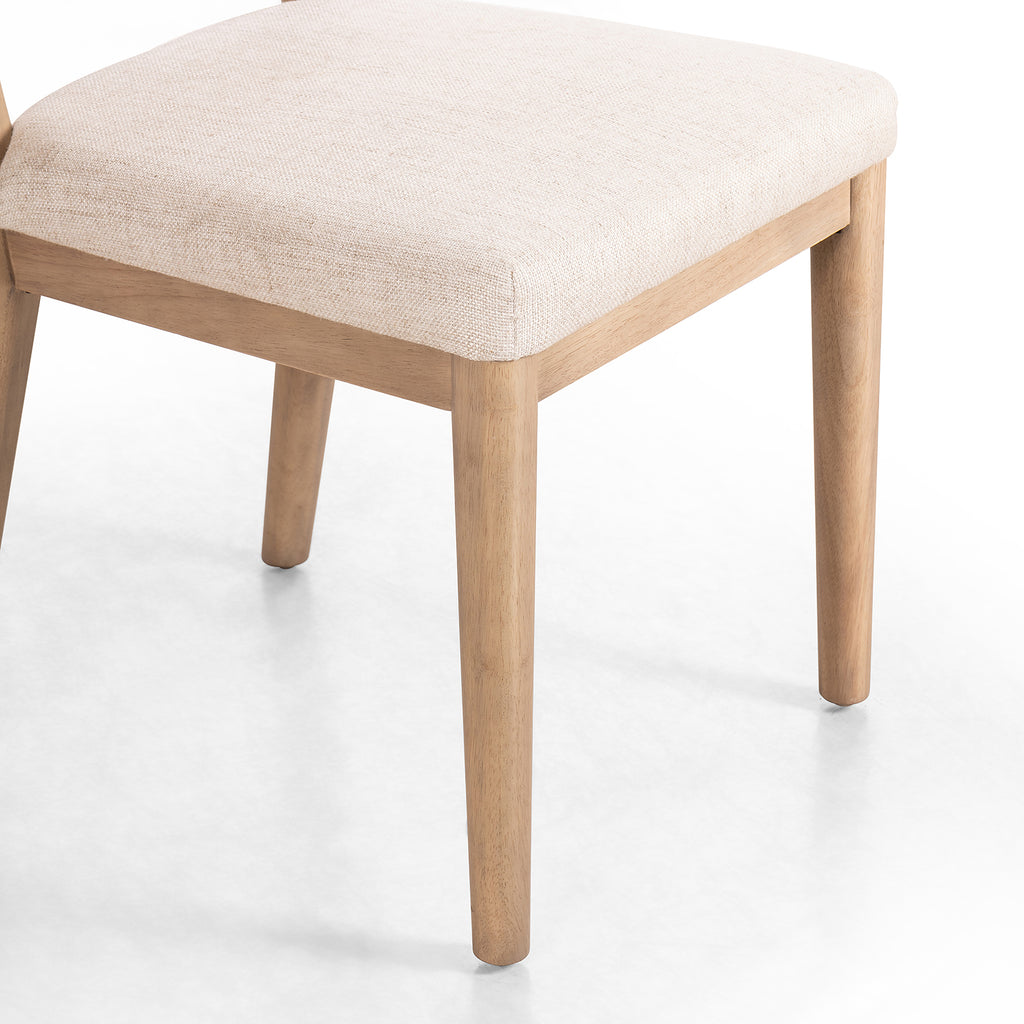 Natural parawood forms a curved barrel back for a shapely take on everyday dining, with textural off-white fabric that moves between styles with ease.