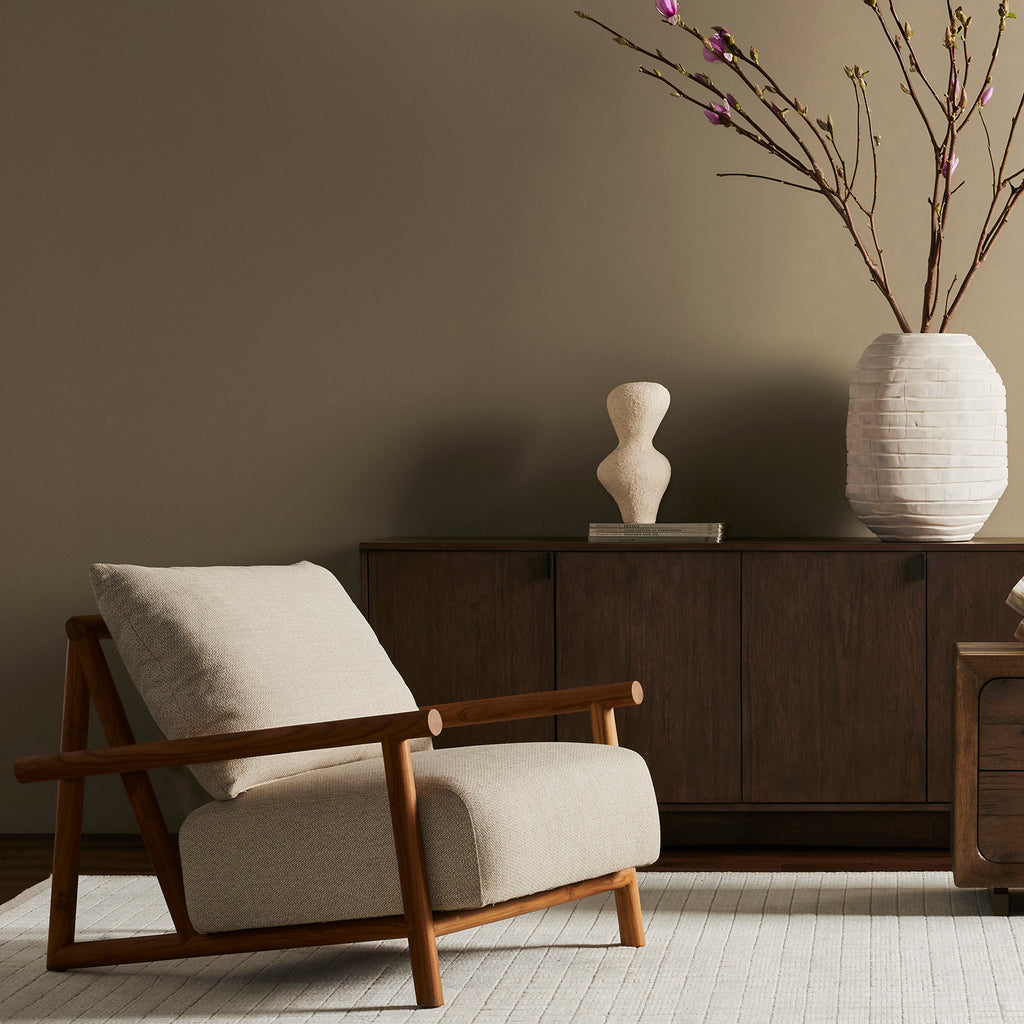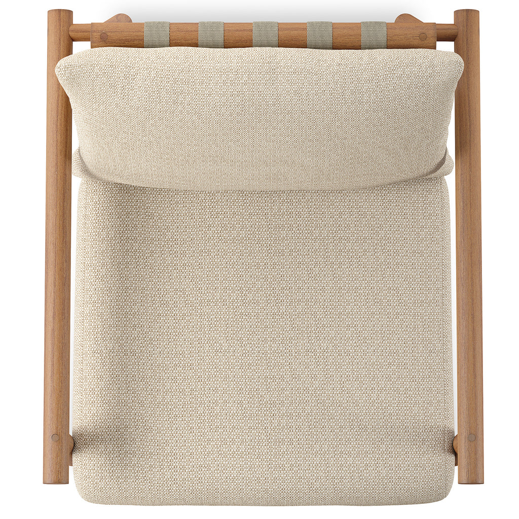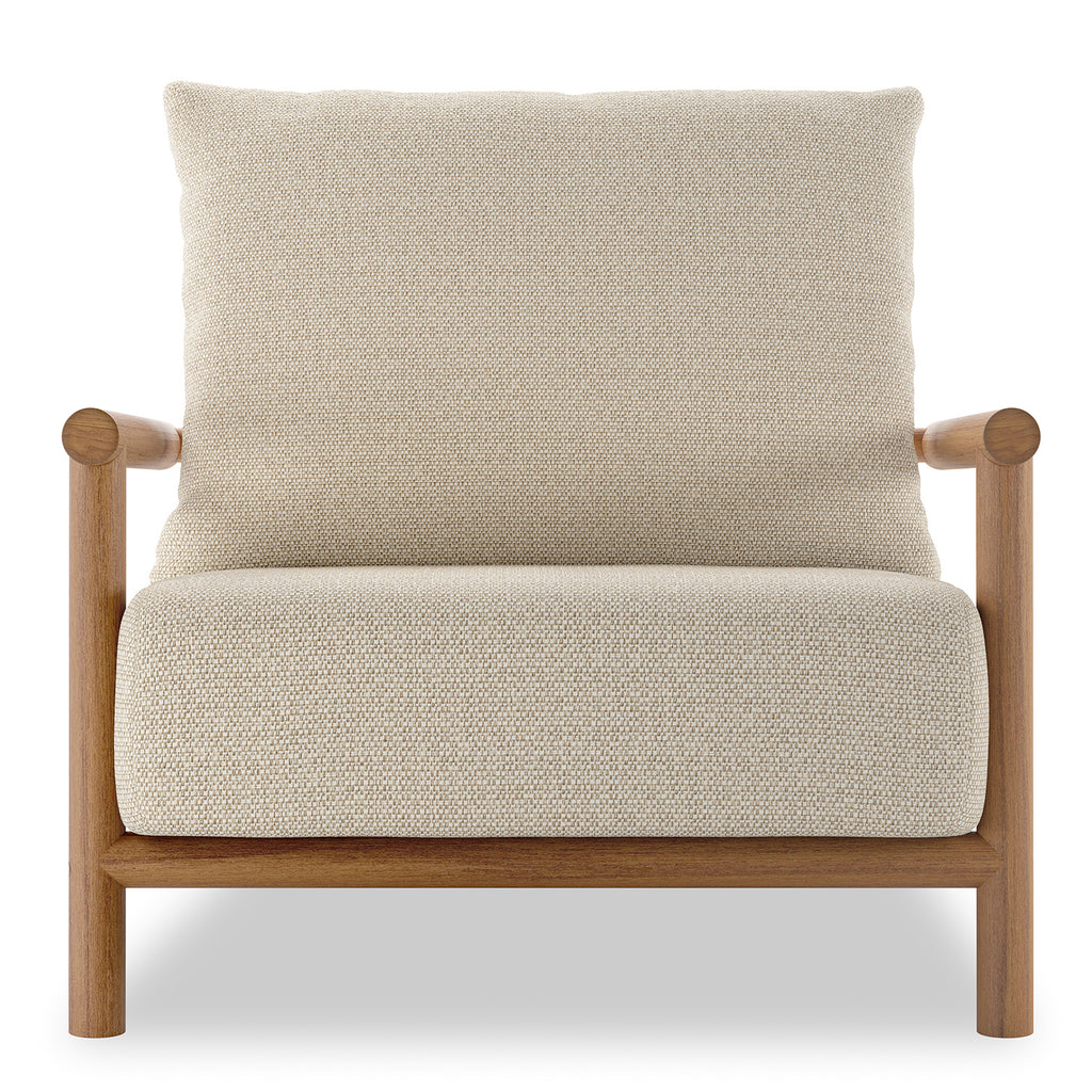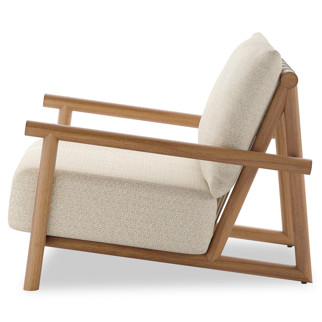 Angular FSC®-certified teak framing paired with softened dowel edges crafts a bench-made, transitional outdoor chair. Strap detailing supports the loose, knife-edge back cushion, complemented by a heavy fixed seat cushion — adding a touch of weight to the airy design. Cover or store indoors during inclement weather and when not in use.