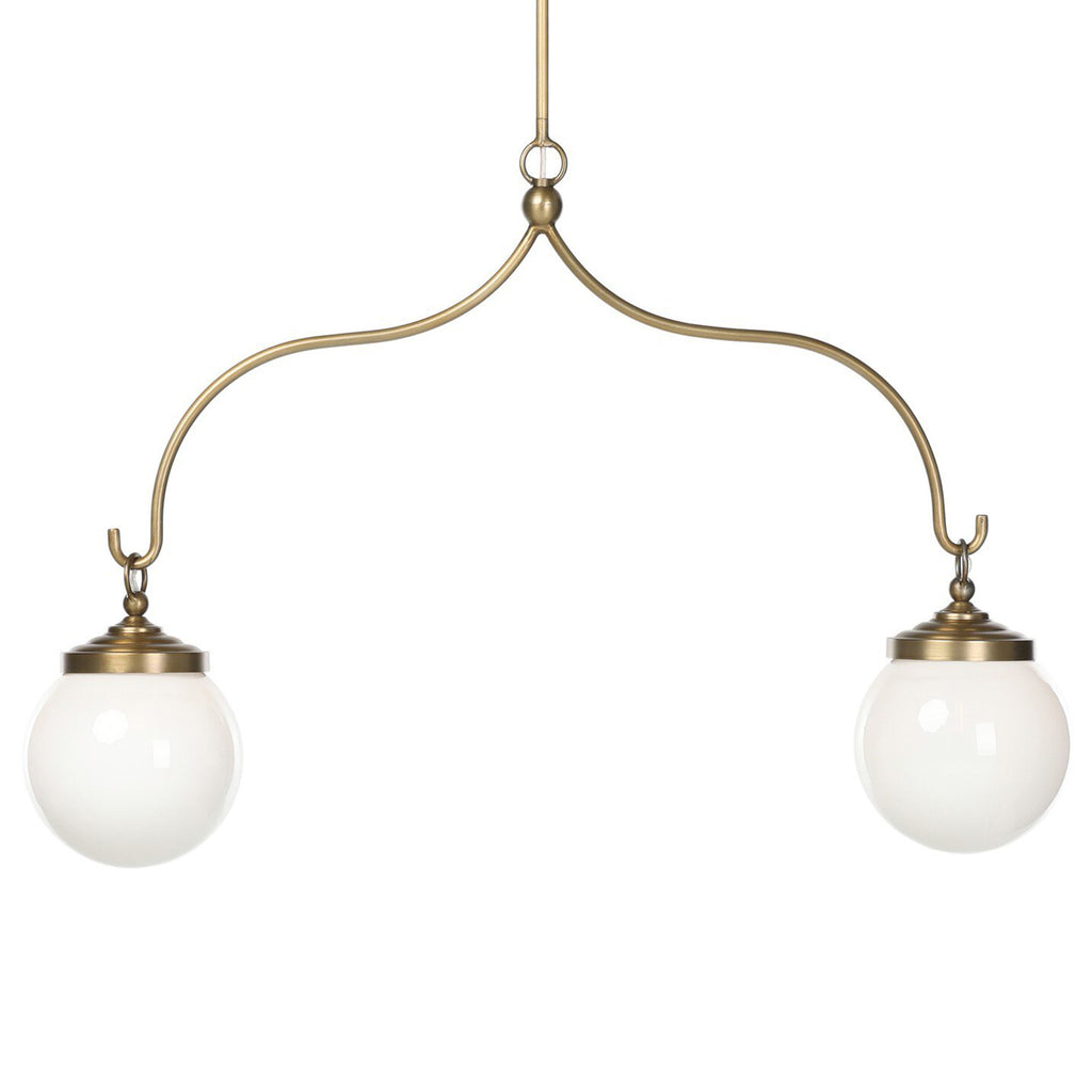 A chandelier inspired by Art Deco, featuring a pair of glass globes suspended from graciously curved iron arms finished in aged brass.