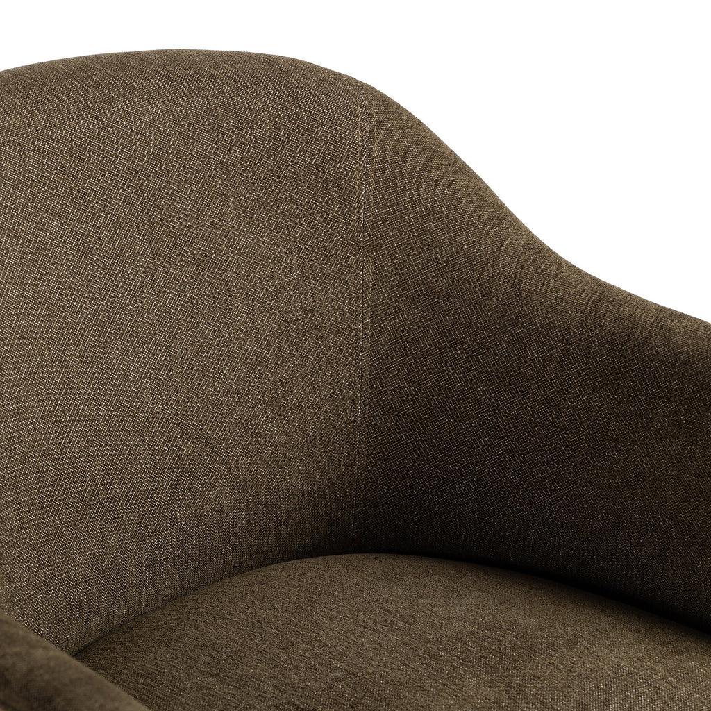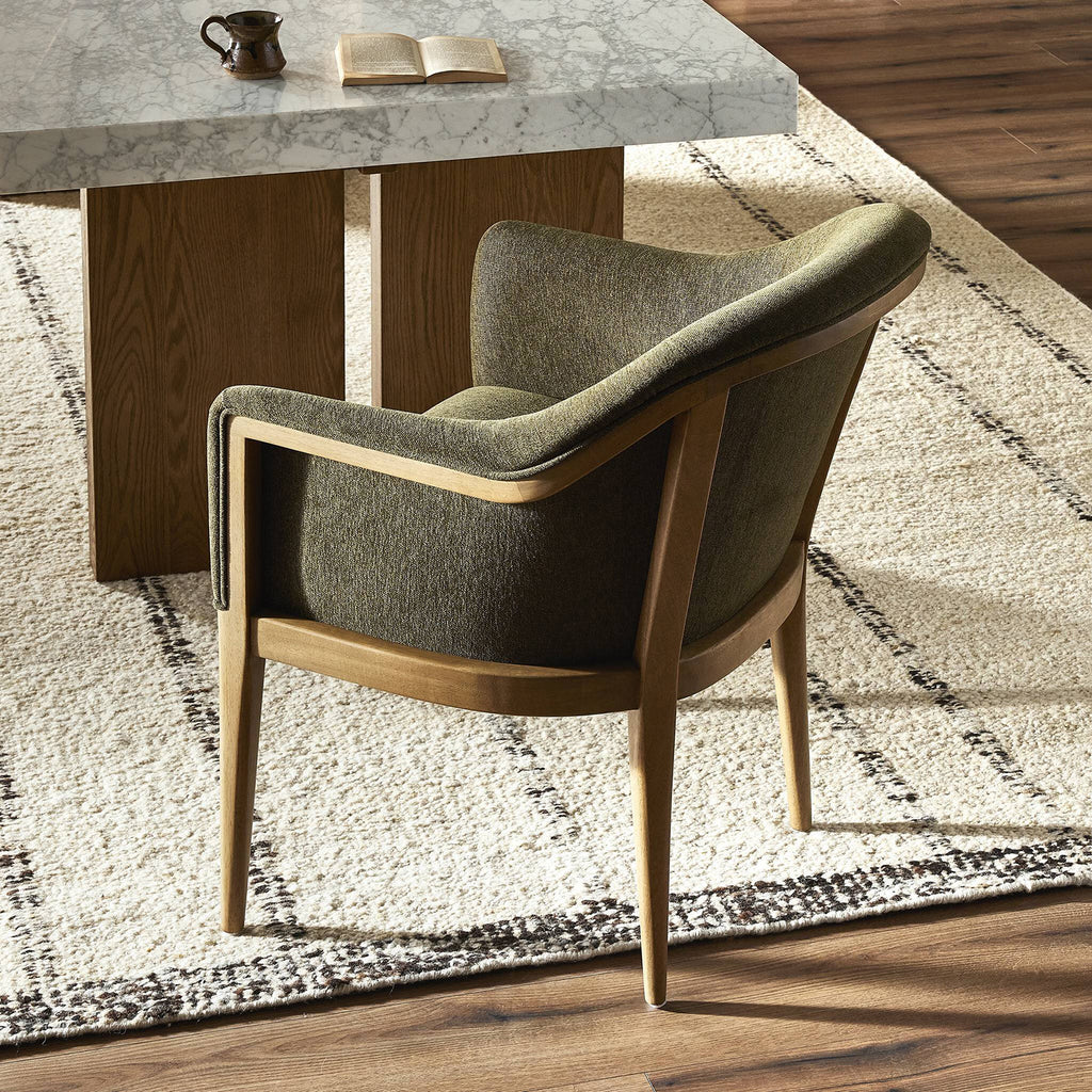 A Swedish Gustavian inspired captain chair gets a modern update with high arms and an exposed frame. The tight cushion in olive fabric paired with buff parawood lends a luxe natural feel.