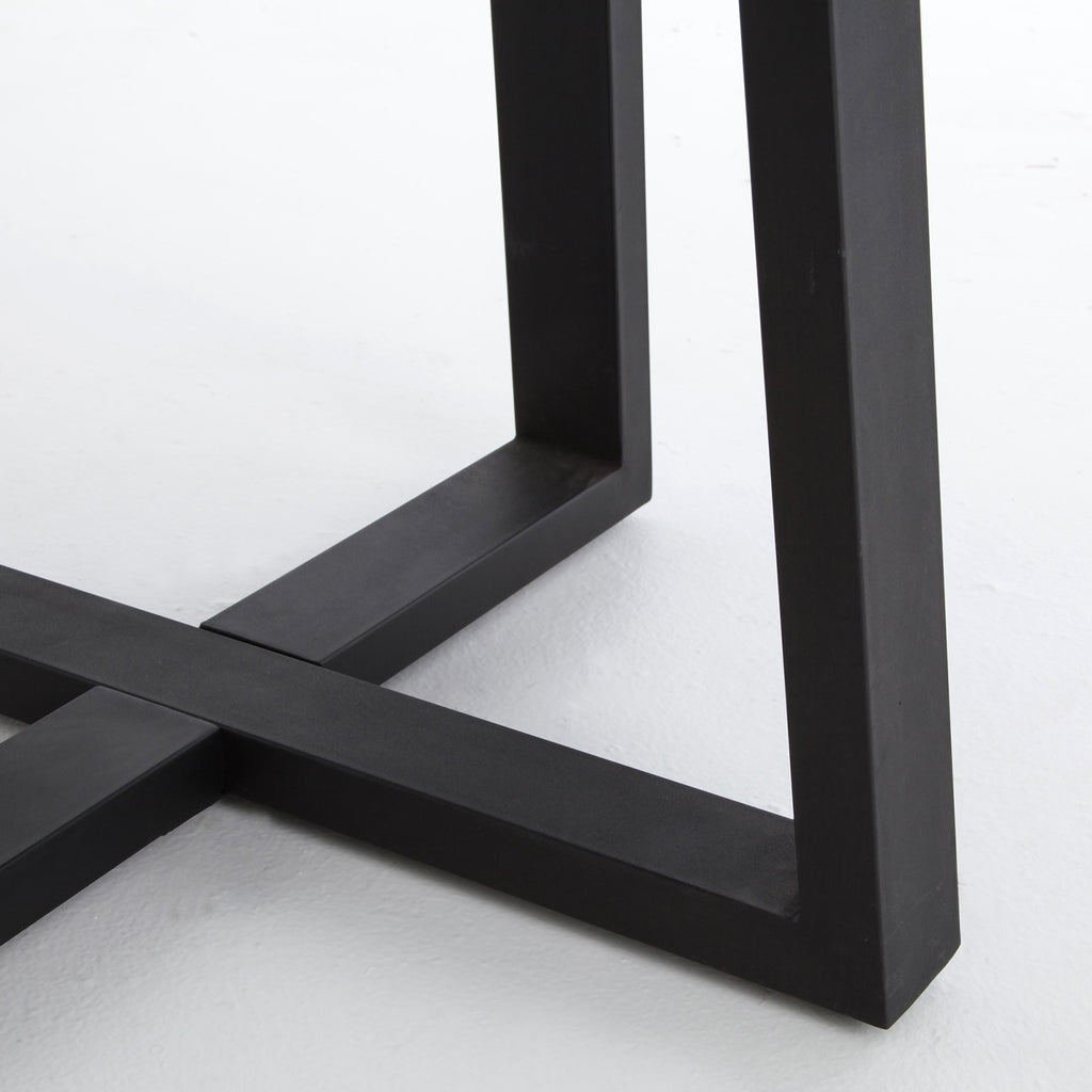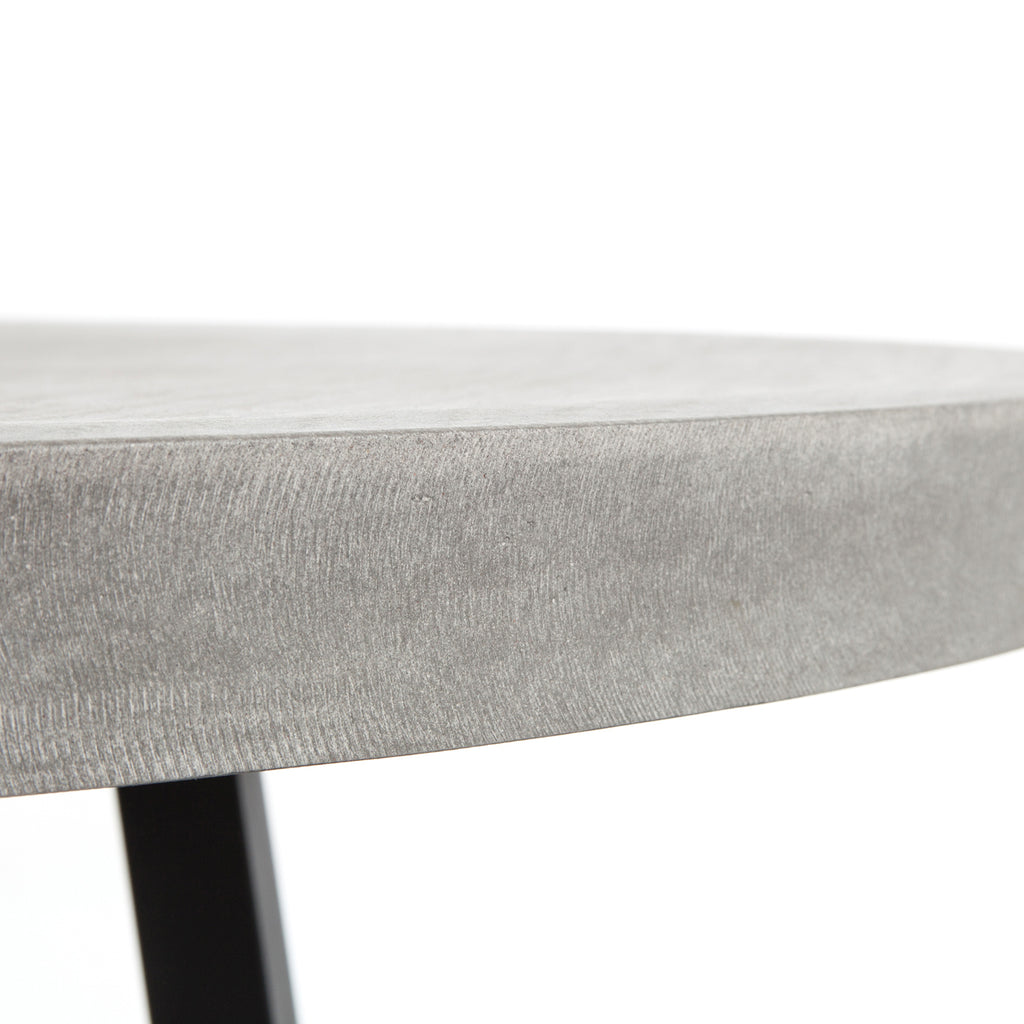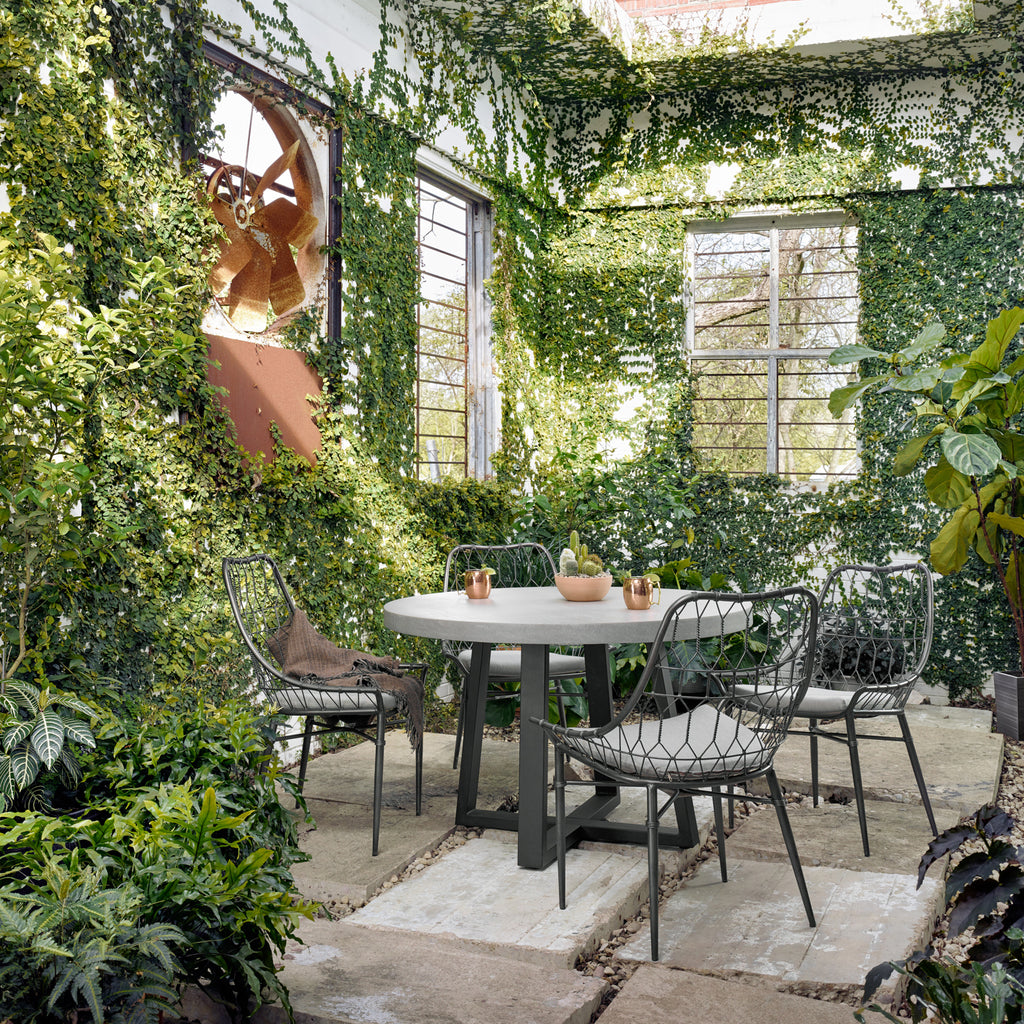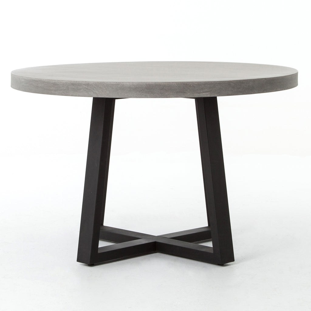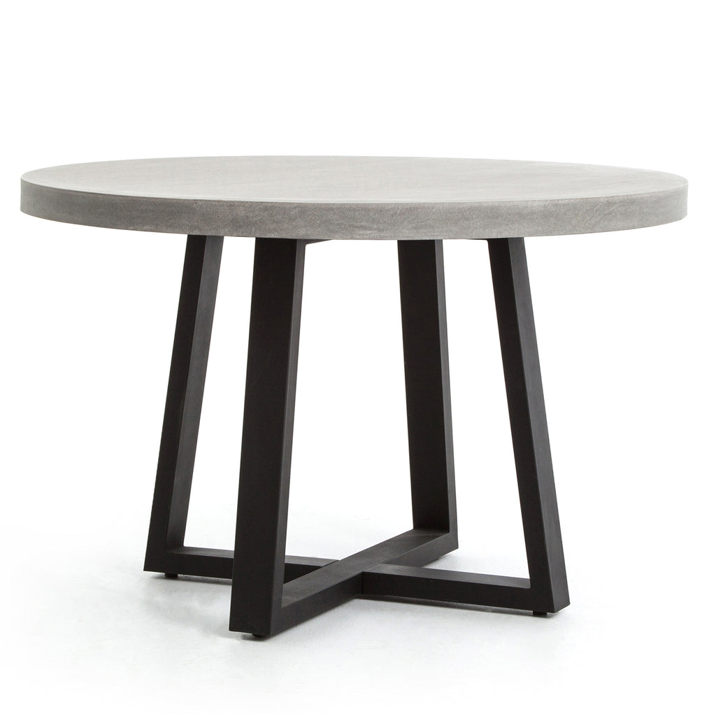 Resolutely modern, Four Hands furniture collection mixes materials and influences for a fresh, inspired look. A strikingly simple, poly-resin top derived from river sand is polished to a smooth sheen. The angled, iron base adds architectural appeal to this round dining table. Great indoors or out, cover or store indoors during inclement weather and when not in use.