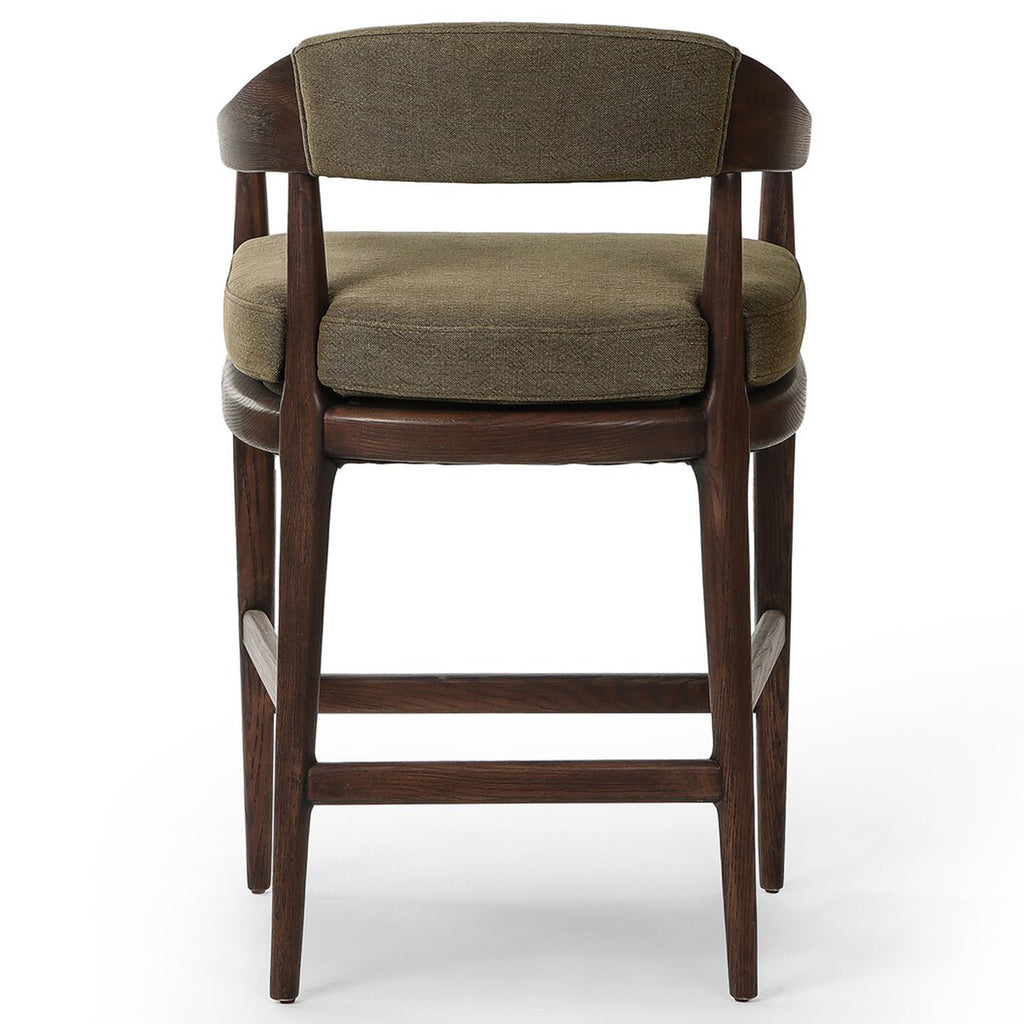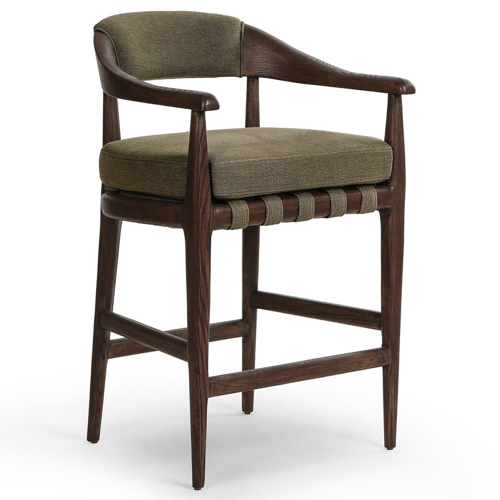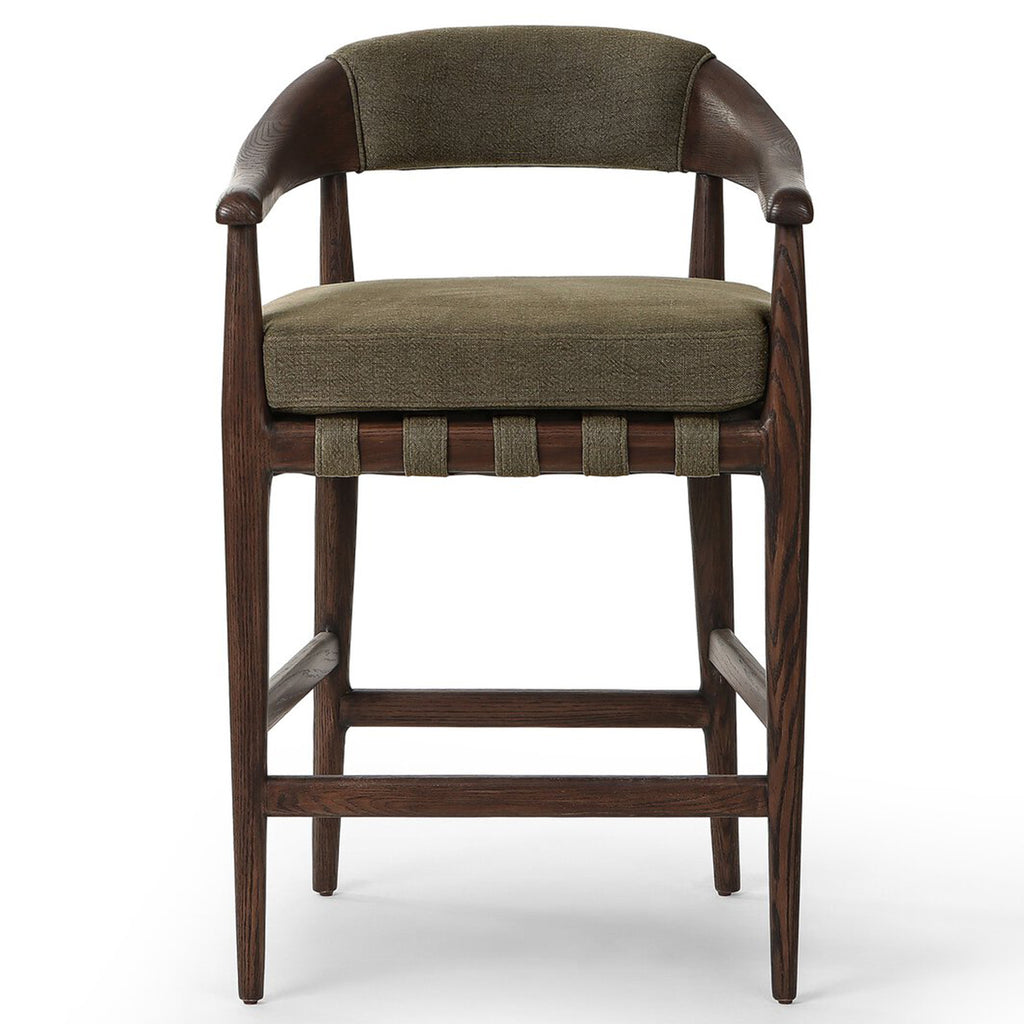 Traditional safari styling is brought to modern speed. A solid wood frame features a webbed seating structure that brings a supported, sink-in feel to the entire piece. The upholstered back, strap details and loose cushion are finished in an olive flax/linen-blend fabric. Perfectly sized for the counter.