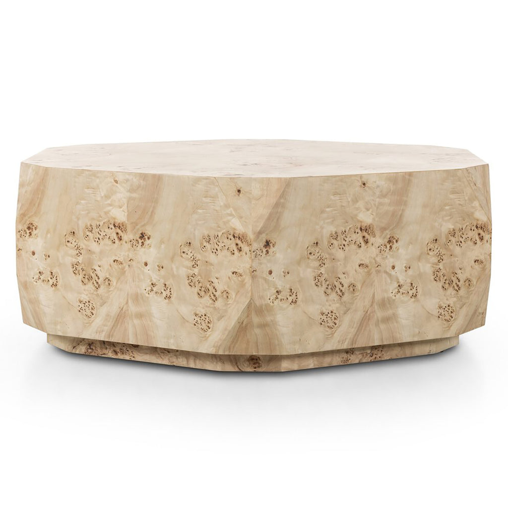 Light poplar burl crafts an organic-looking shape, bringing a sense of moment to this design-forward coffee table. An understated plinth base finishes the look while adding intriguing balance of scale.