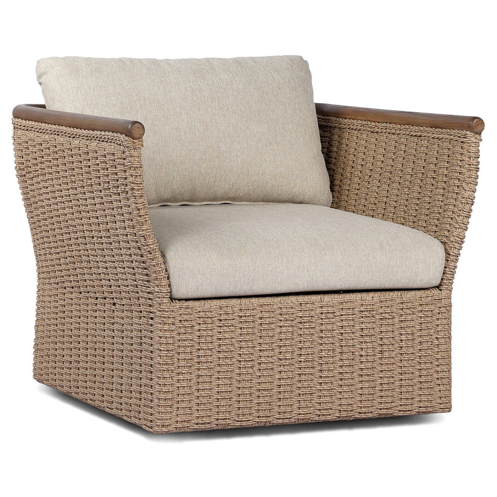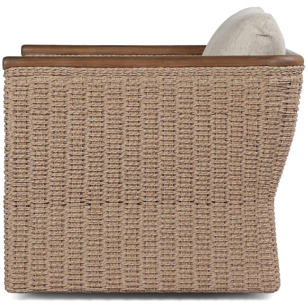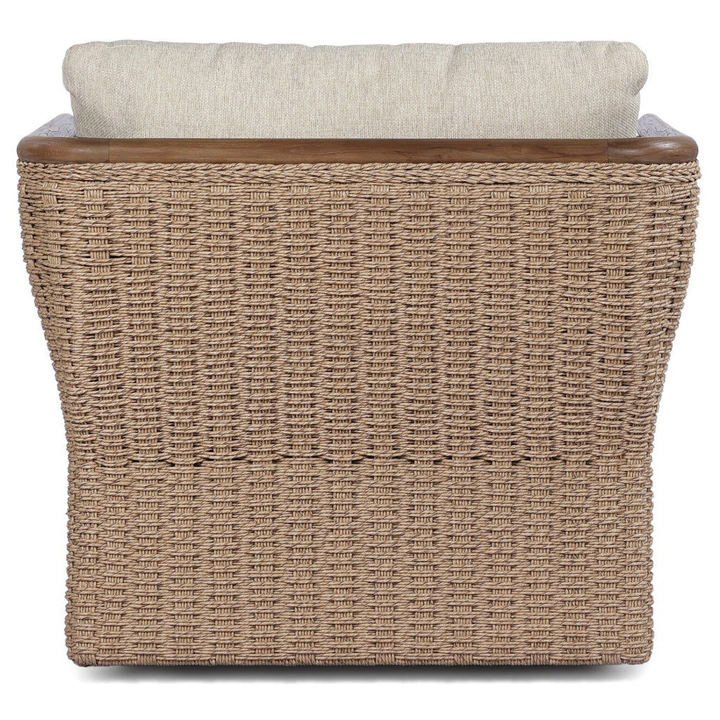 Fresh takes on the classic 360 swivel chair. A woven faux hyacinth frame finishes in a wood accent piece around the top, with an earth-toned pair of cushions for easy relaxation. Cover or store inside during inclement weather and when not in use.