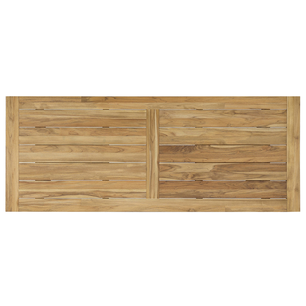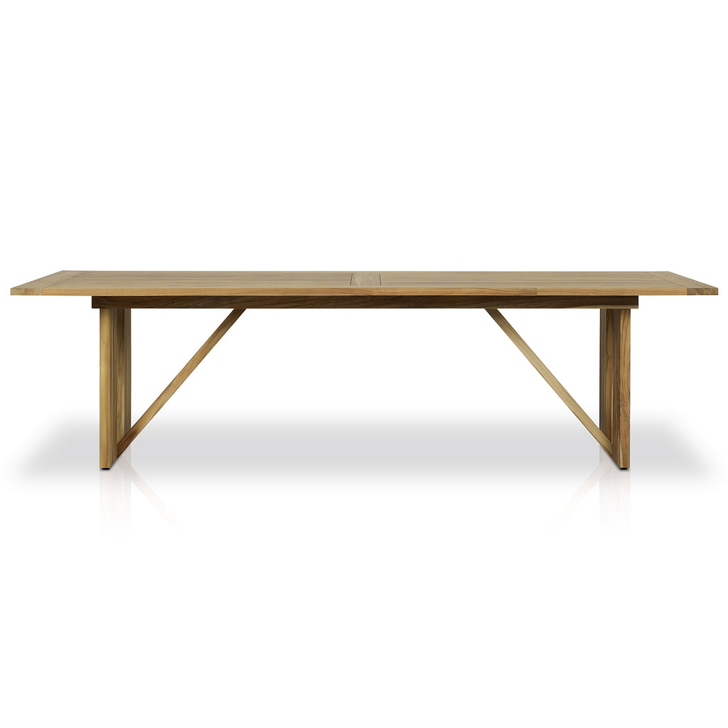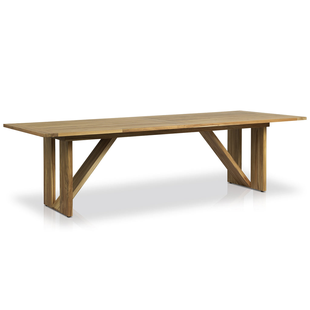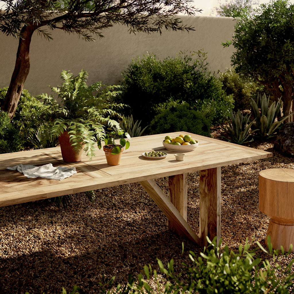 A modern trestle-style outdoor dining table designed with linear detailing. FSC®-certified teak offers a transitional finish that can pair with an array of styles. Cover or store in Doors during inclement weather and when not in use.