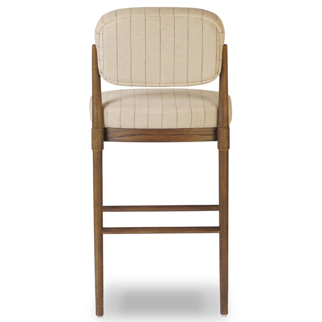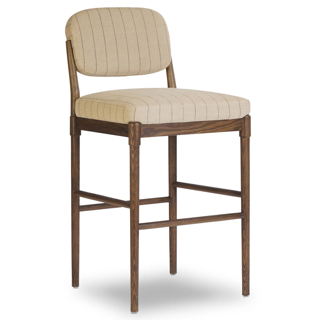 Modern materials place an updated twist on the traditional counter stool. Linen/cotton blend cushioning features a faint pinstripe for a unique-while-versatile look. Simply framed by brown oak and perfect in pairs or multiples.