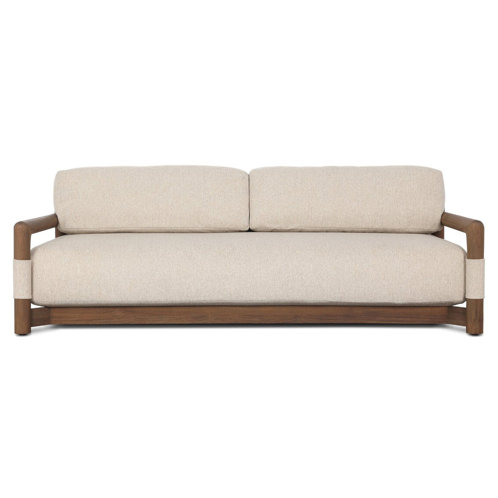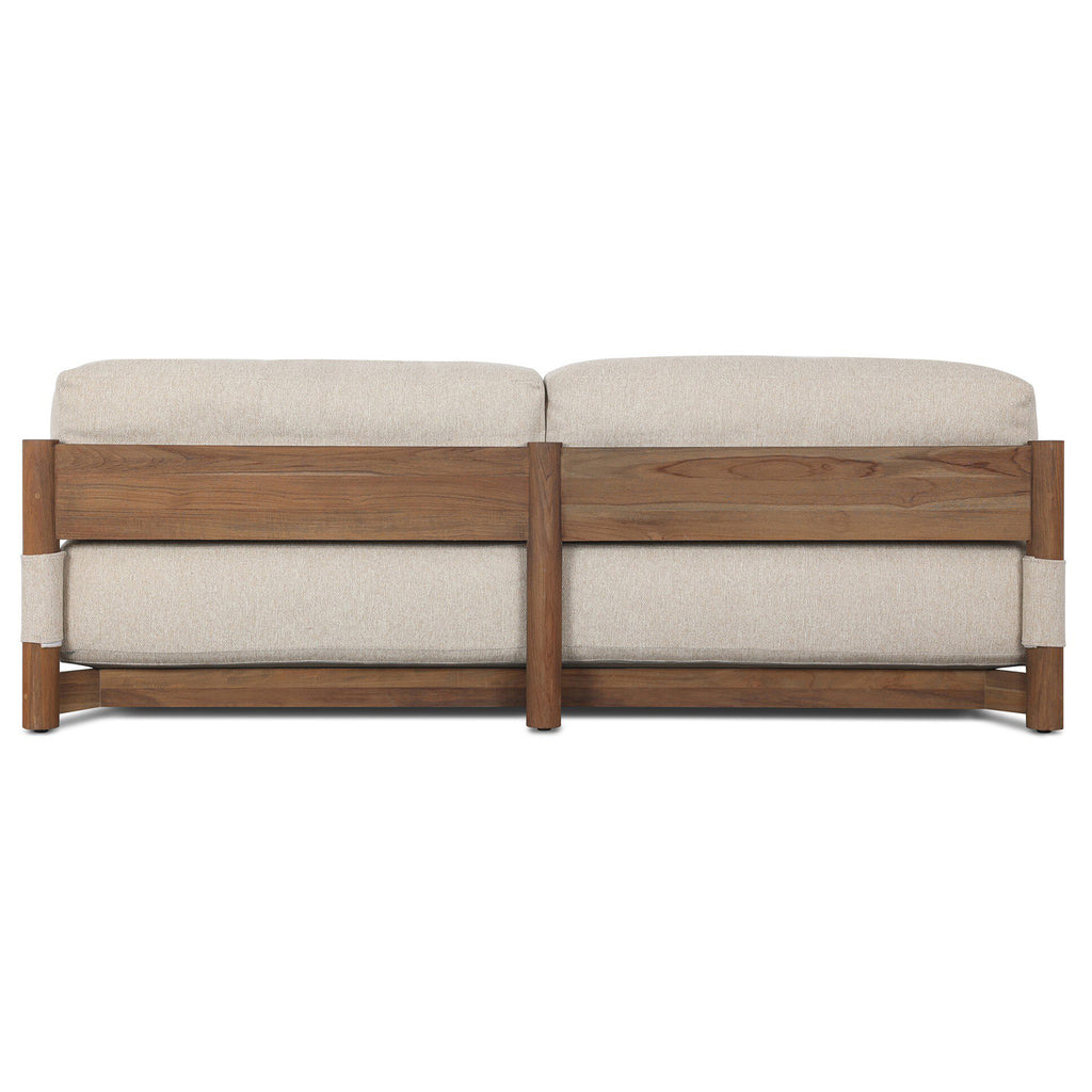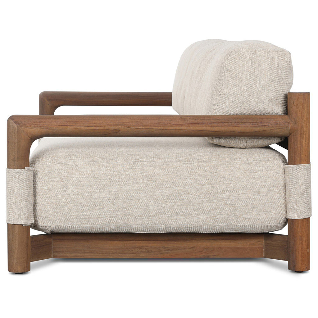 Inflated shaping brings max comfort. Thick cushioning and rounded arms anchor this outdoor sofa, framed by FSC-certified teak and upholstered in a light beige fabric that fastens to the legs. Cover or store indoors during inclement weather and when not in use.