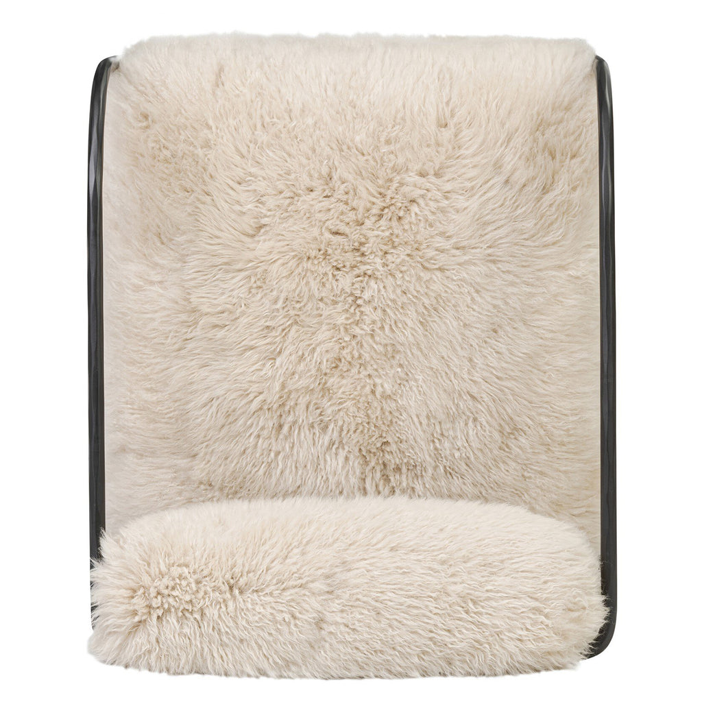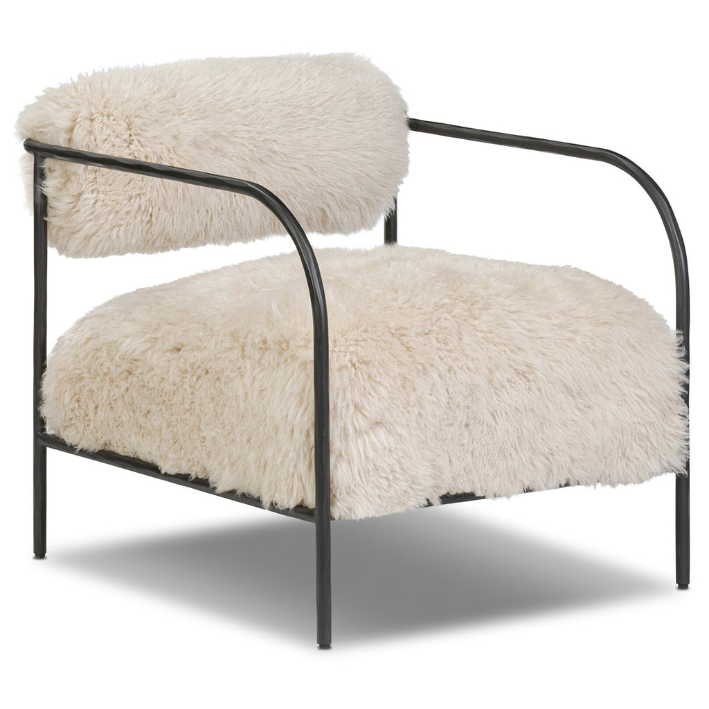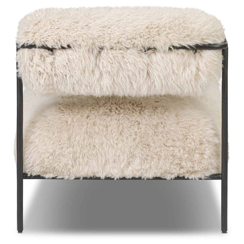 A textural take on a timeless silhouette. Hammered iron frames a squared seat and bolster back upholstered in off-white Mongolian fur.