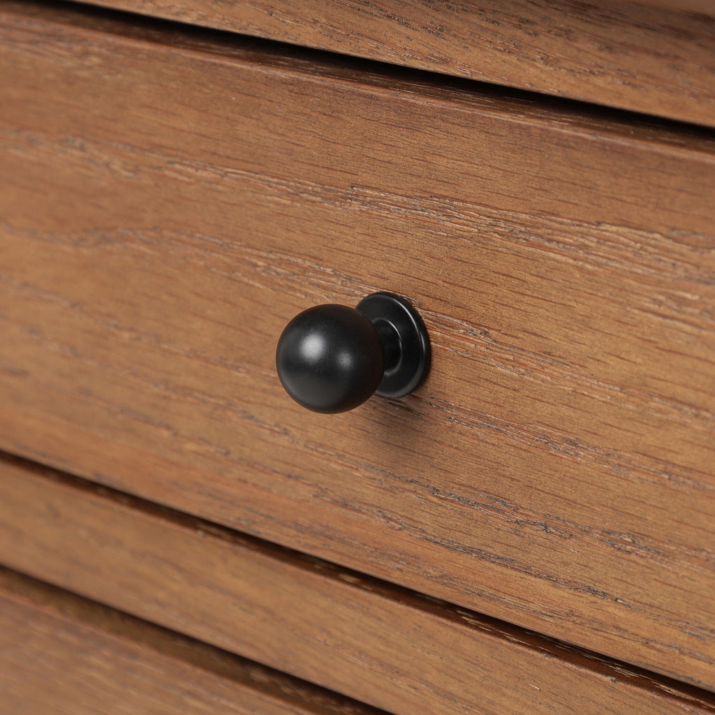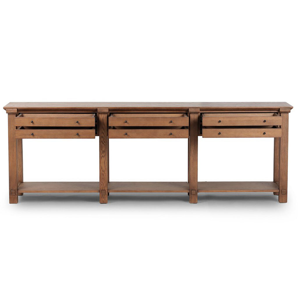 Crafted from warm oak with iron accents and designed with storage in mind, six drawers and open lower shelf create endless possibilities for organization and display. Exposed joint details on legs and shelving bring an elevated, artisanal feel to any space.
