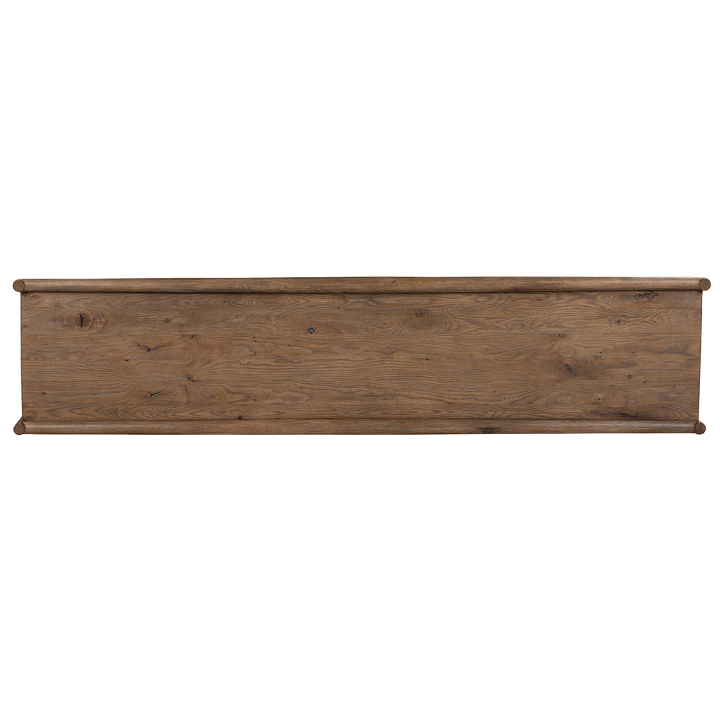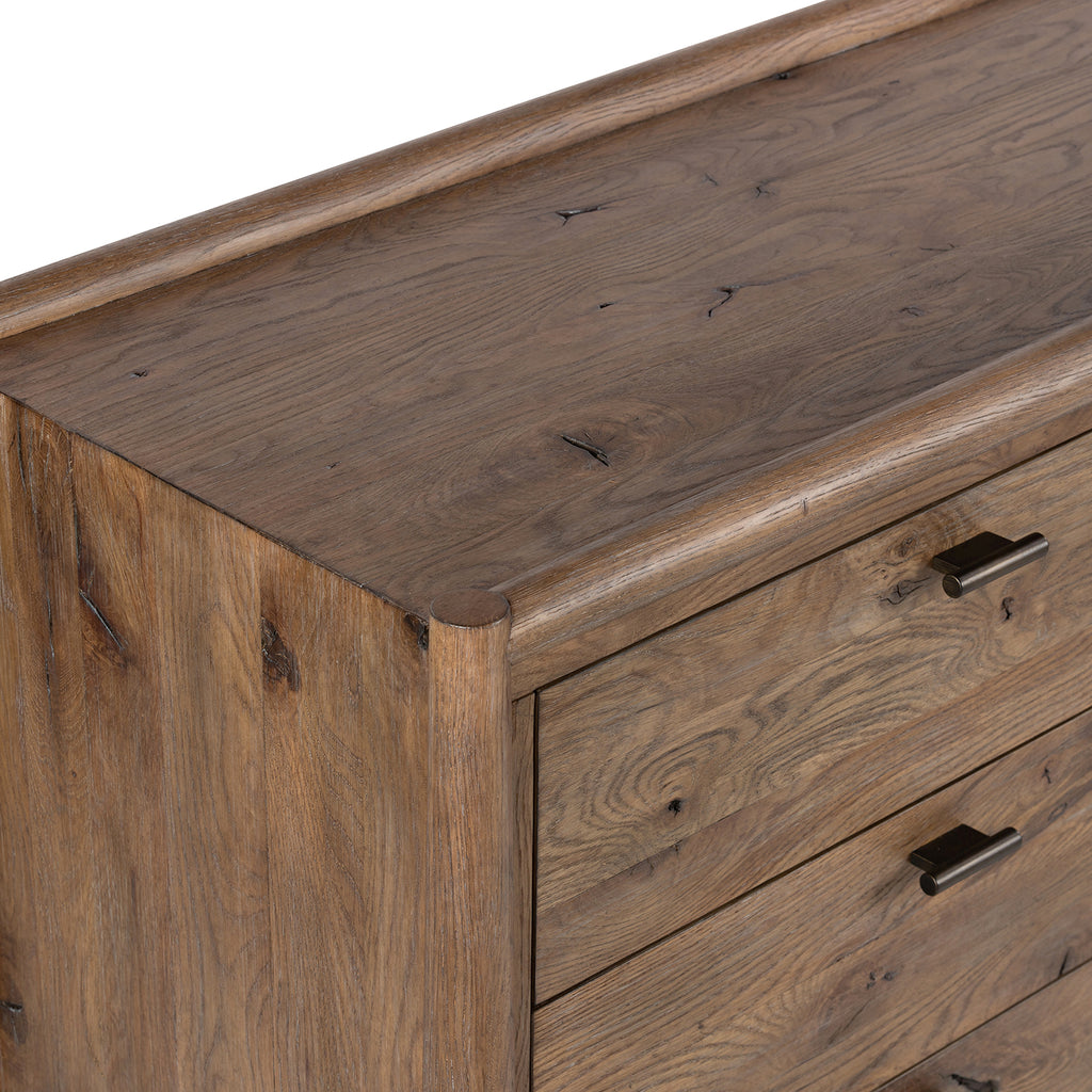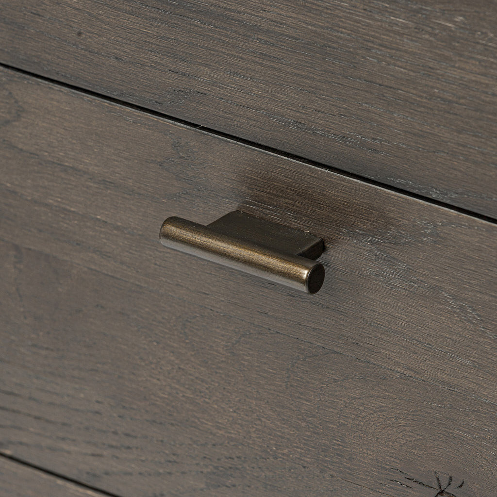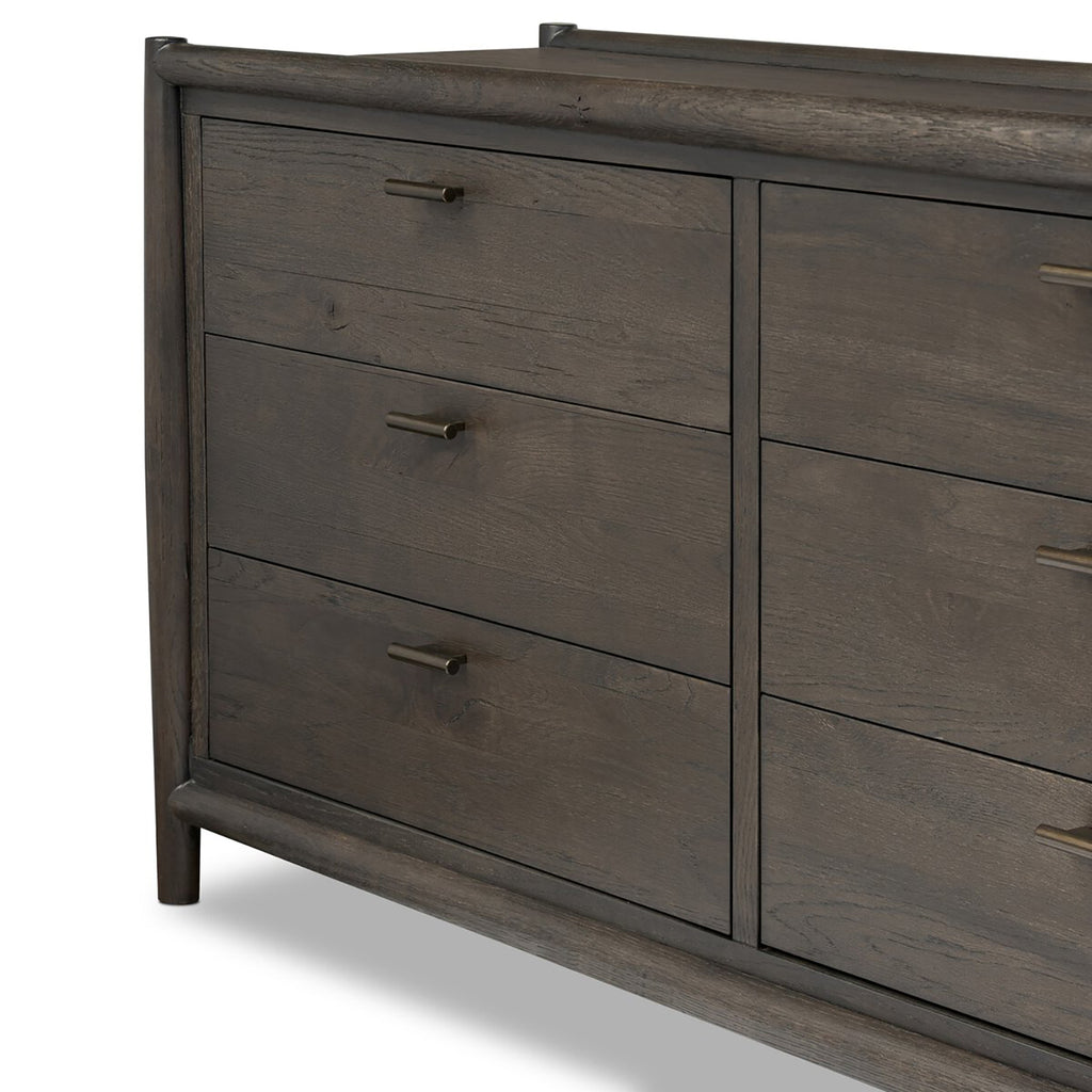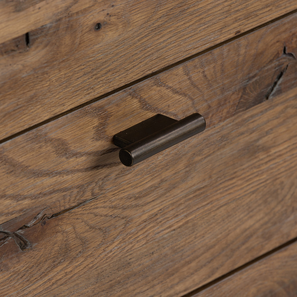 The traditional spindle structure brought to modern speed. Made from weathered oak with a light, rustic finish, six spacious drawers bring generous storage space to the bedroom. Simple cylindrical hardware is finished in an aged bronze.