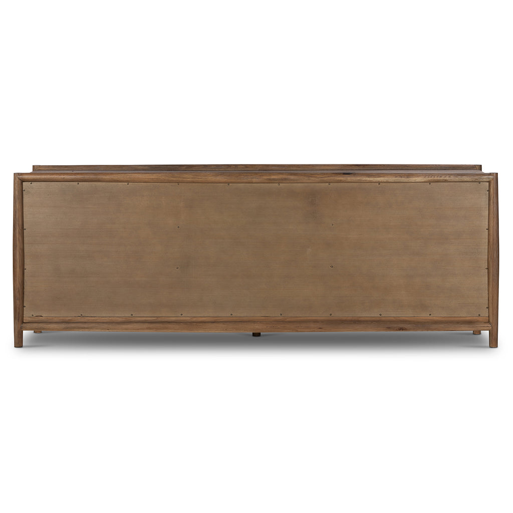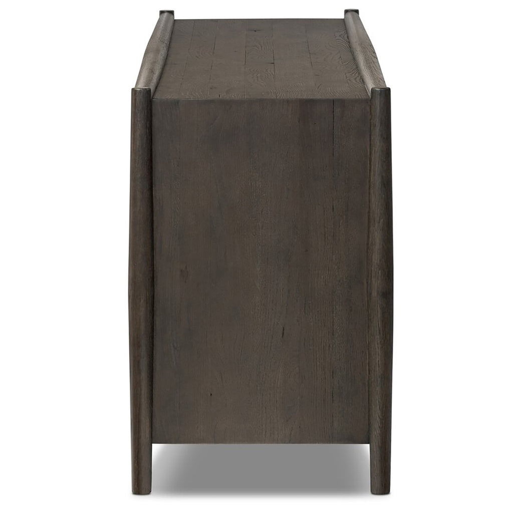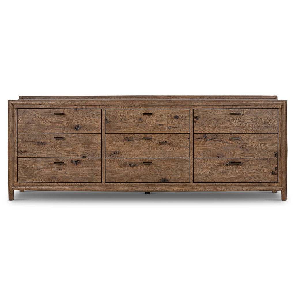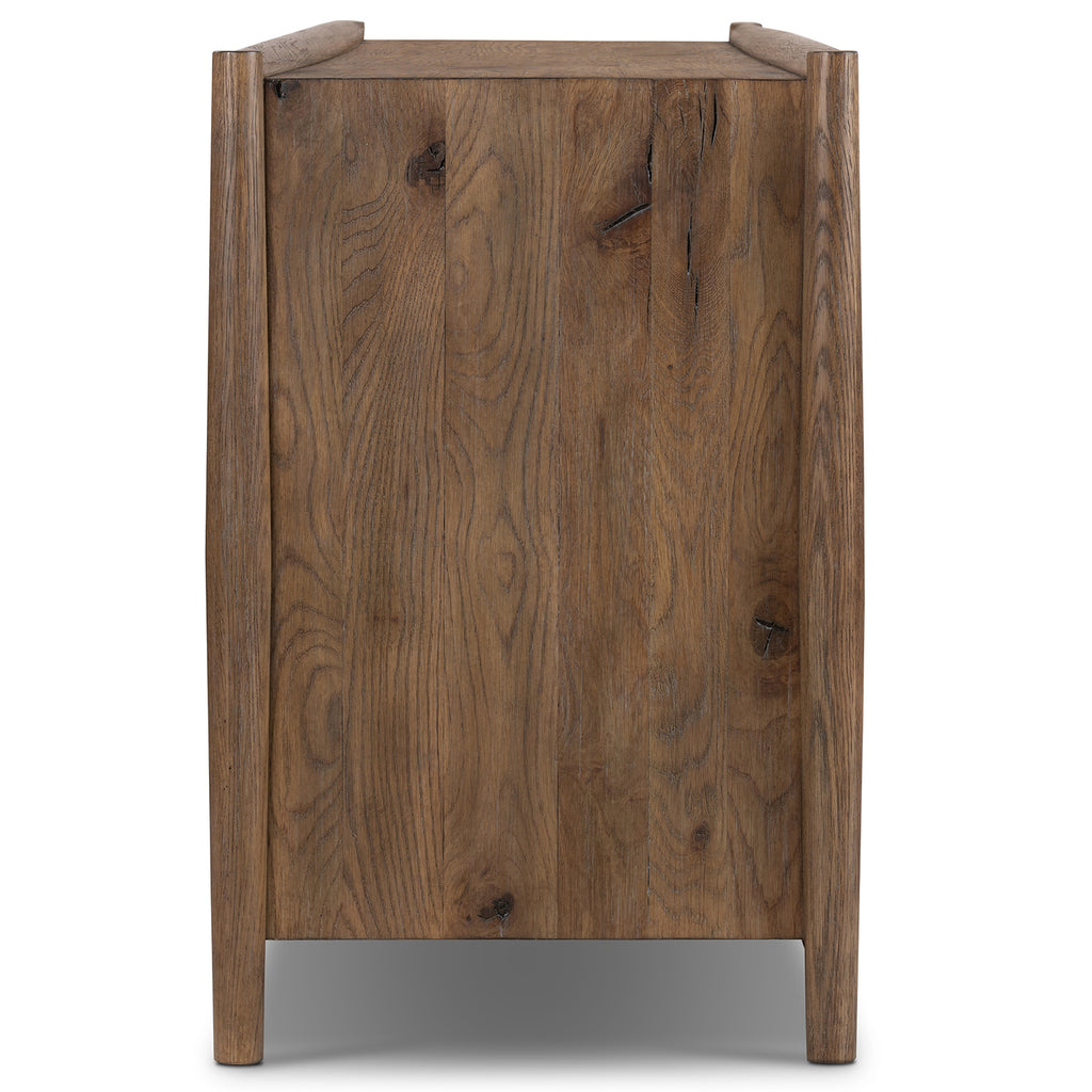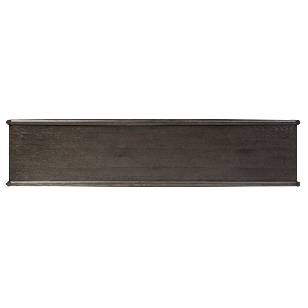 The traditional spindle structure brought to modern speed. Made from weathered oak with a light, rustic finish, six spacious drawers bring generous storage space to the bedroom. Simple cylindrical hardware is finished in an aged bronze.