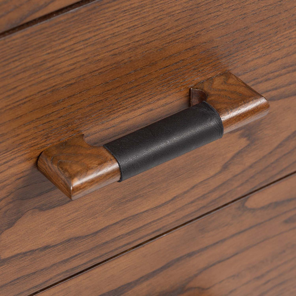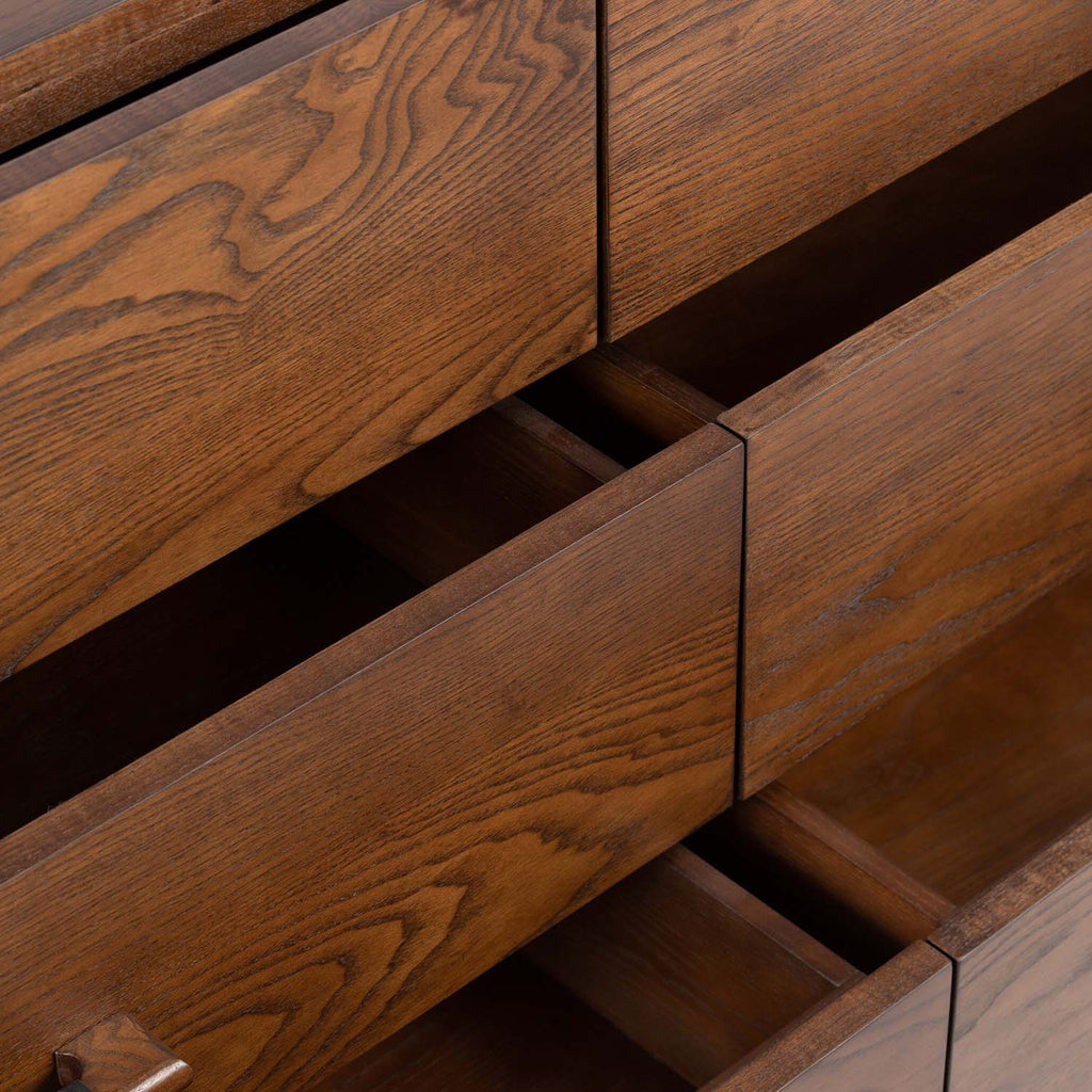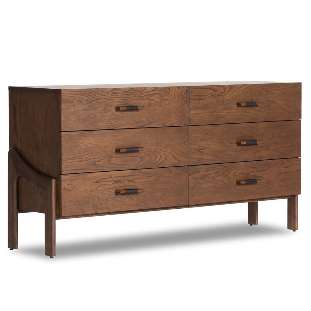 Made from brown-finished ash with leather-wrapped hardware, wide scale and sculptural details reflect the Brazilian midcentury inspiration behind this spacious six-drawer dresser. This item has been modified to comply with the STURDY Act. See a full list of modified products and data changes in the “STURDY Act” file in the Downloads section below.