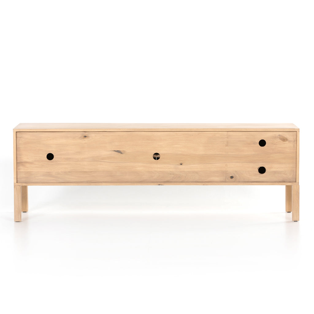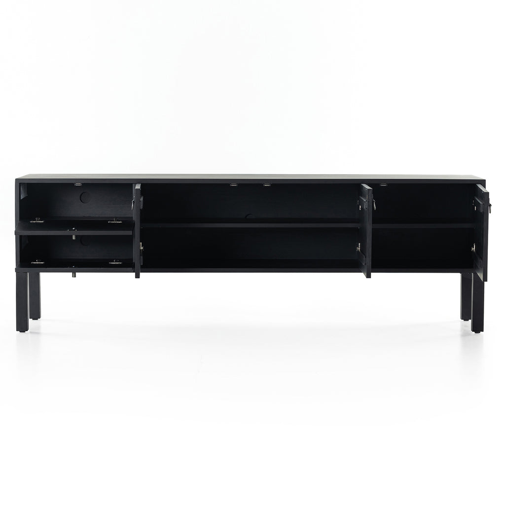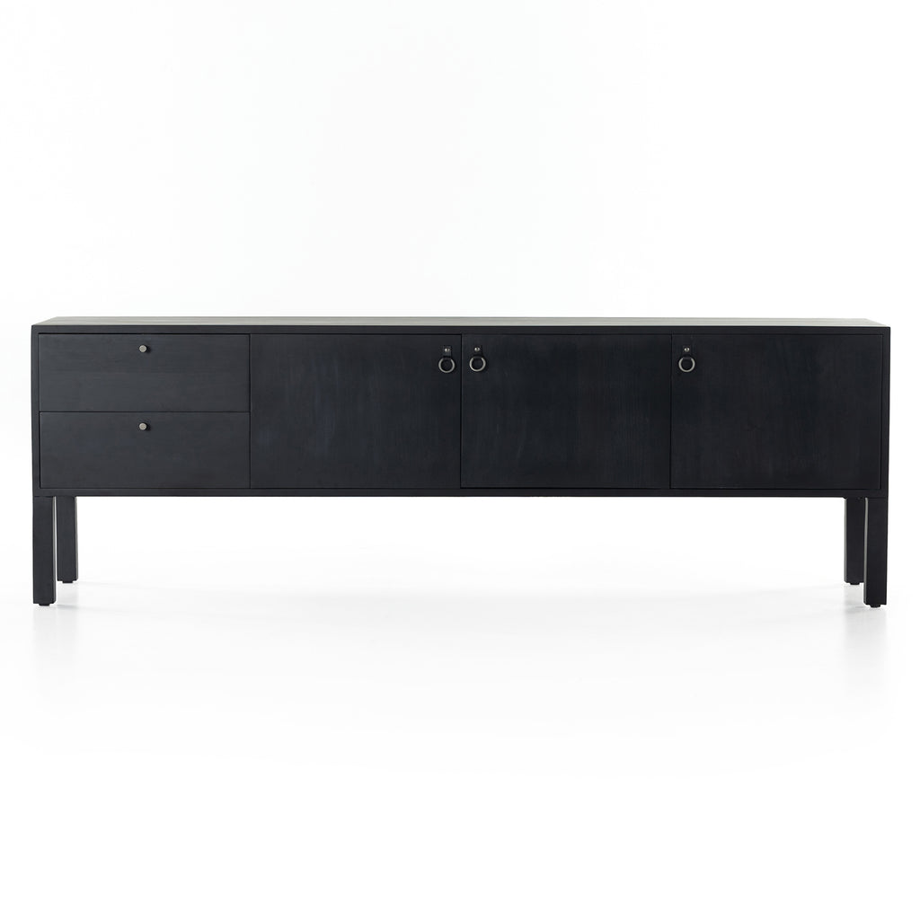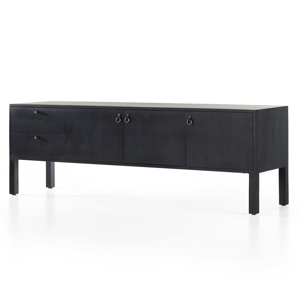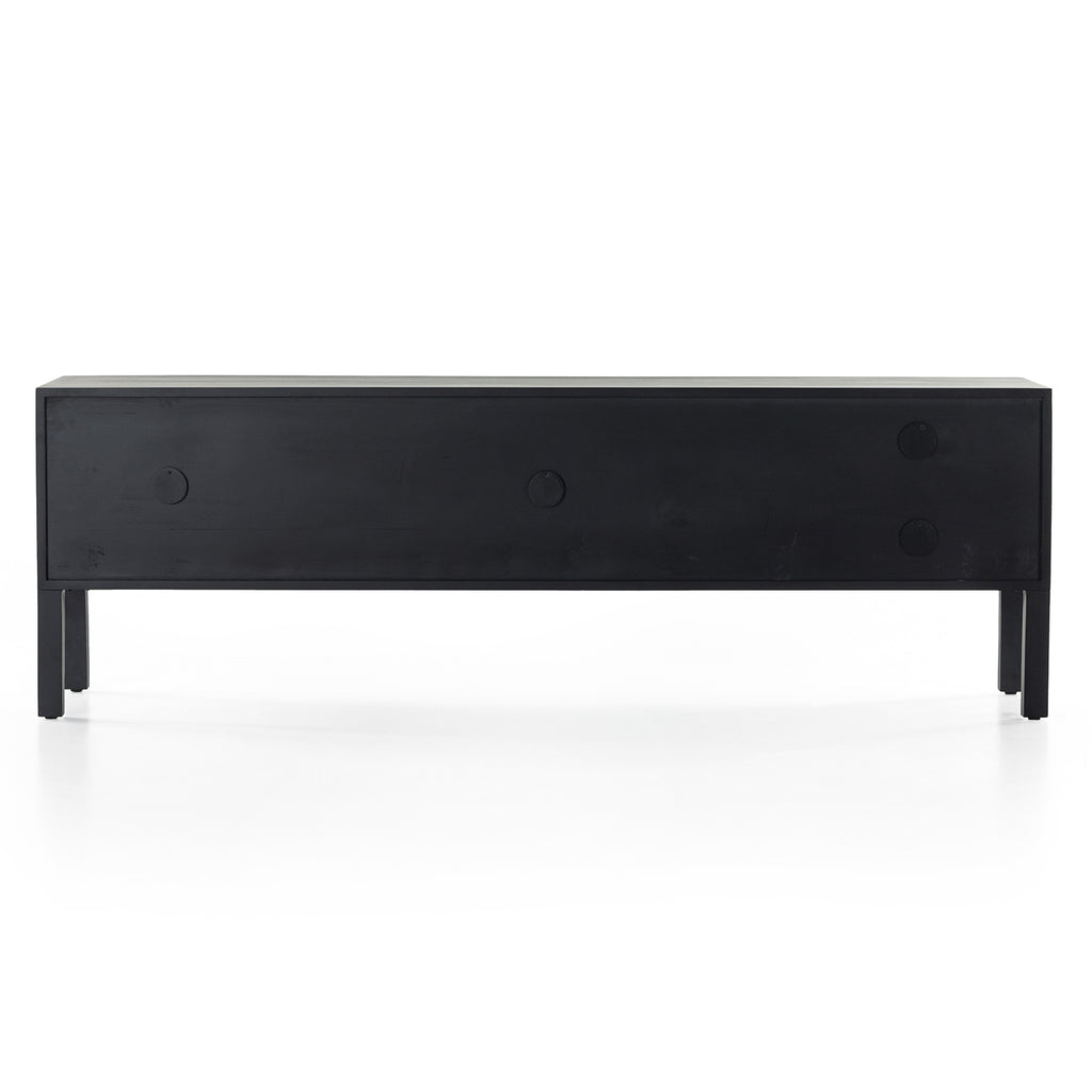 Beautifully simple in spirit. Solid black or dry-washed poplar forms a clean-lined media console with dovetail joinery plus iron and leather hardware, for a fresh, material-driven update to Shaker-inspired styling. Rear cutouts for cord management.