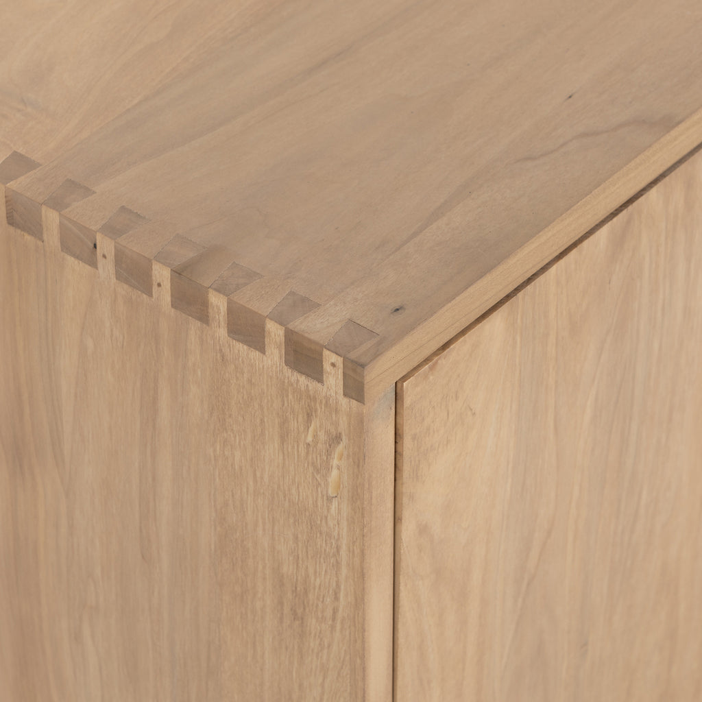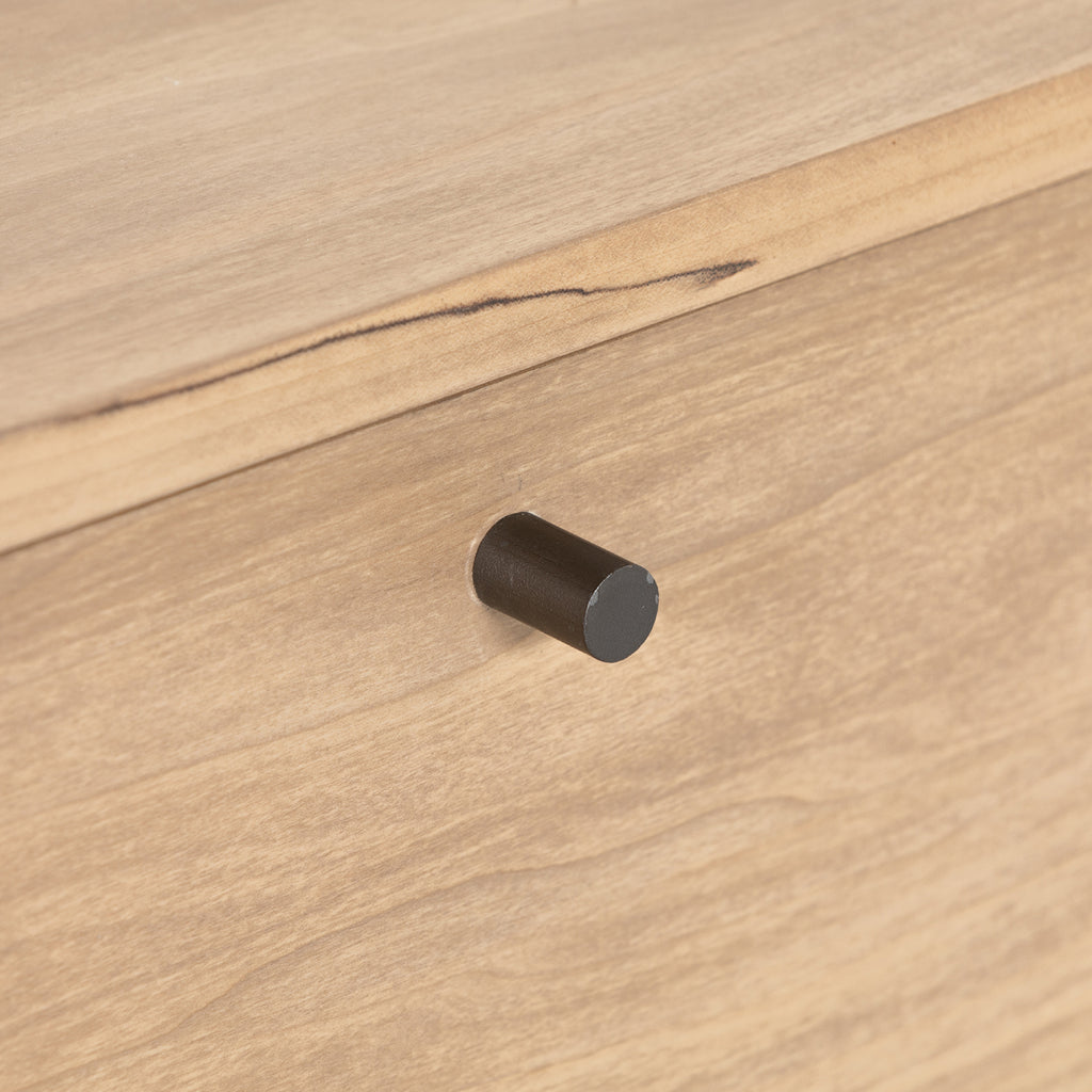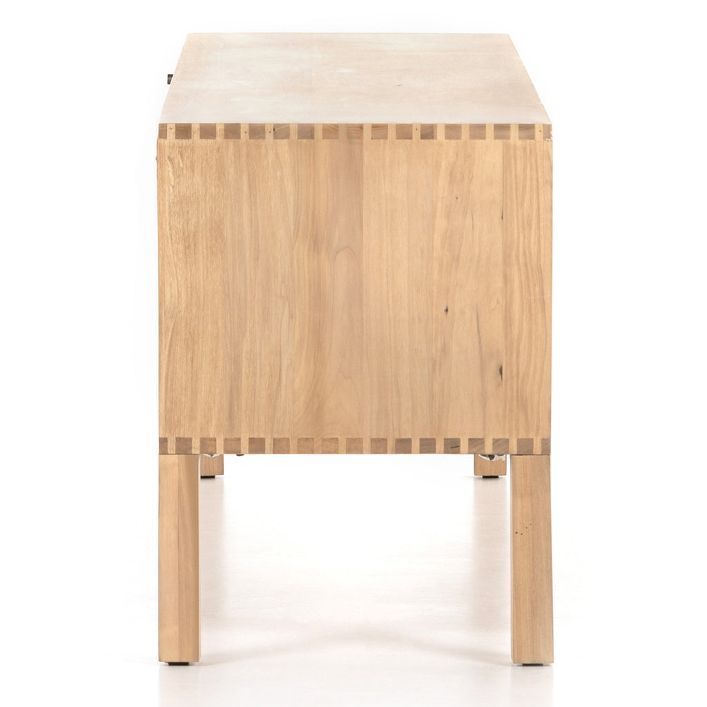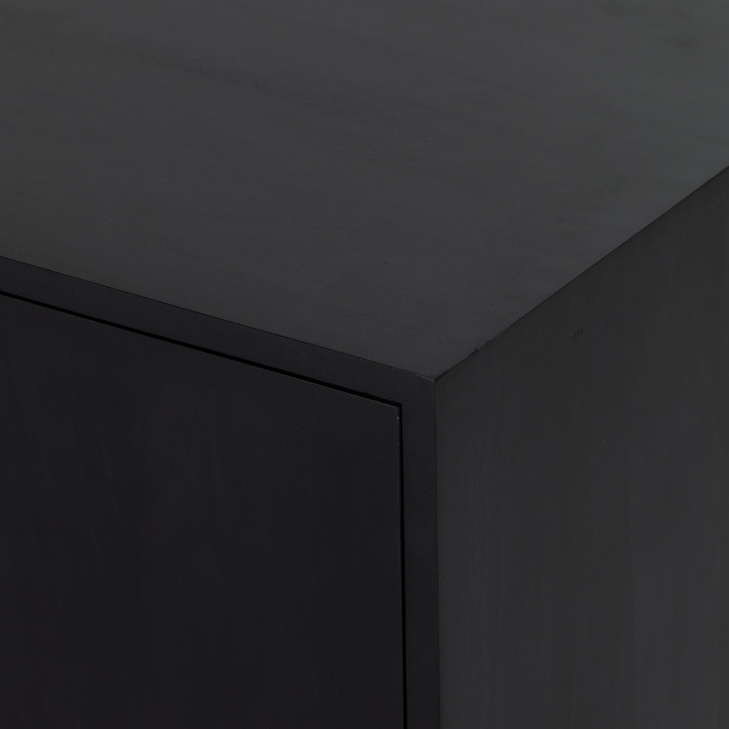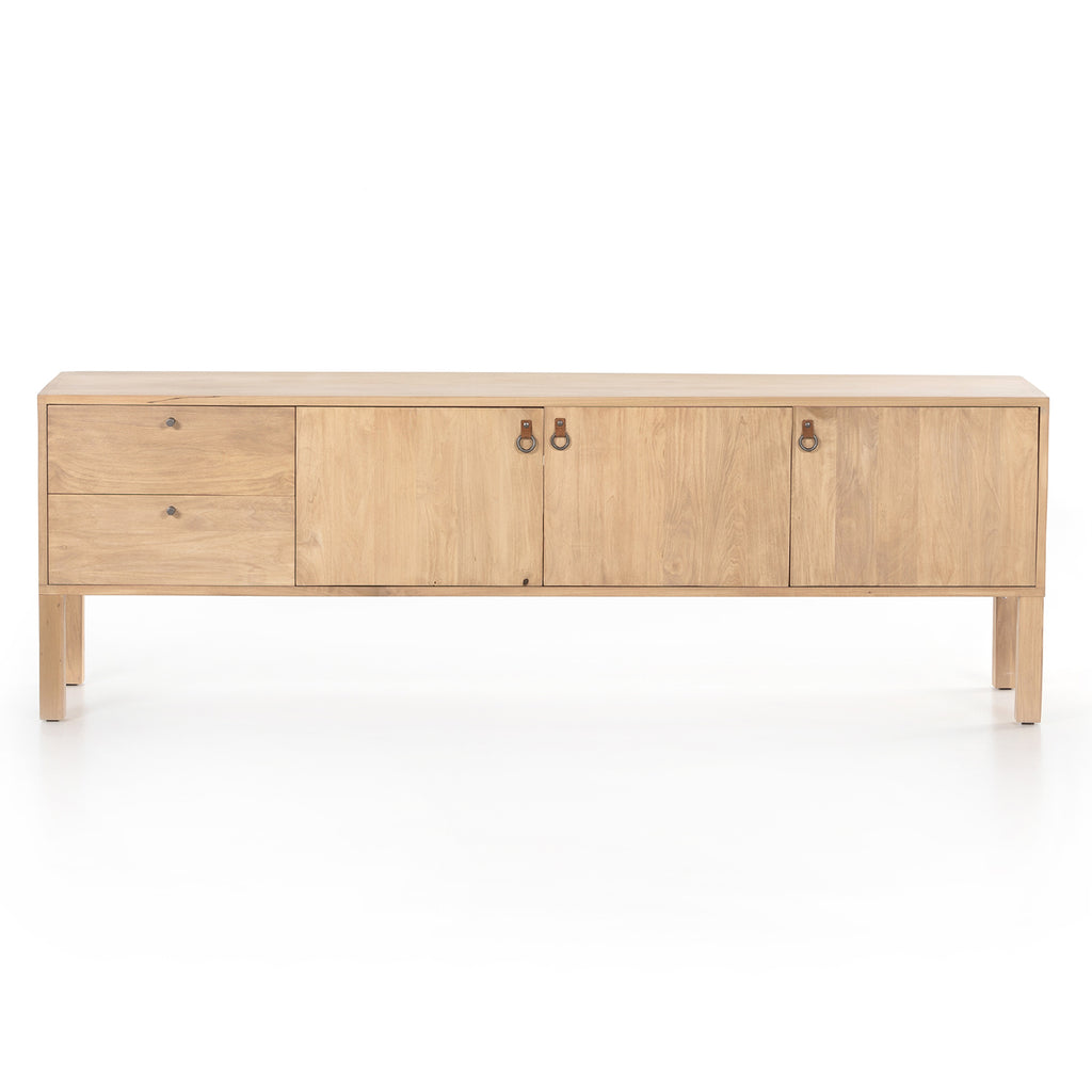 Beautifully simple in spirit. Solid black or dry-washed poplar forms a clean-lined media console with dovetail joinery plus iron and leather hardware, for a fresh, material-driven update to Shaker-inspired styling. Rear cutouts for cord management.