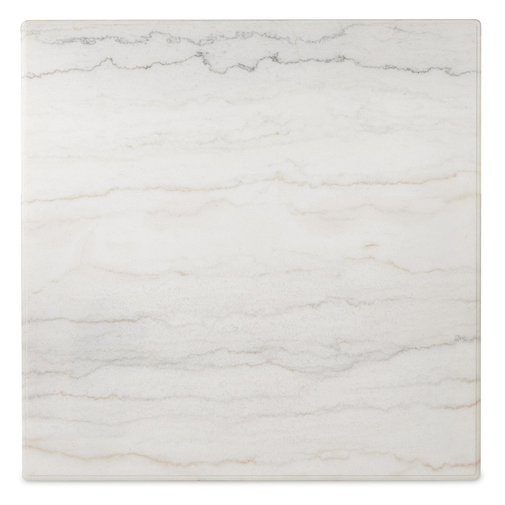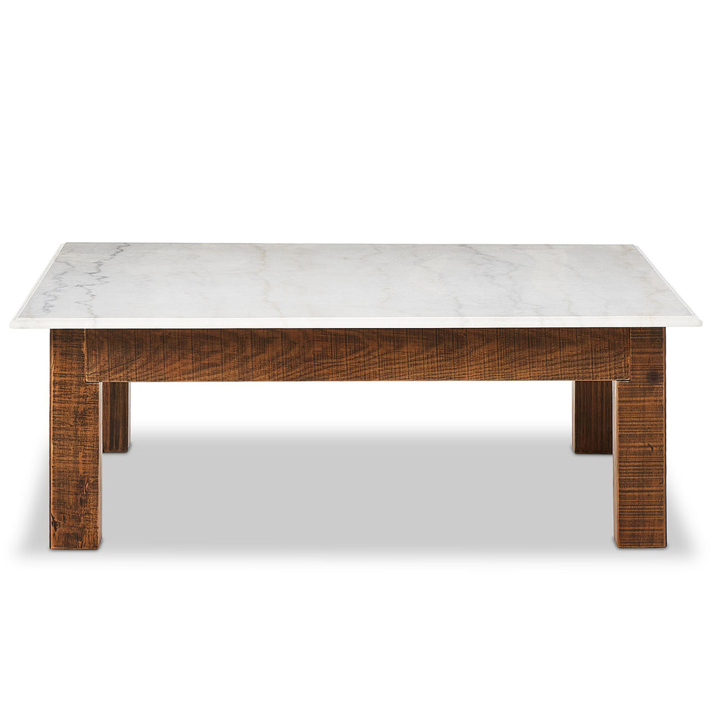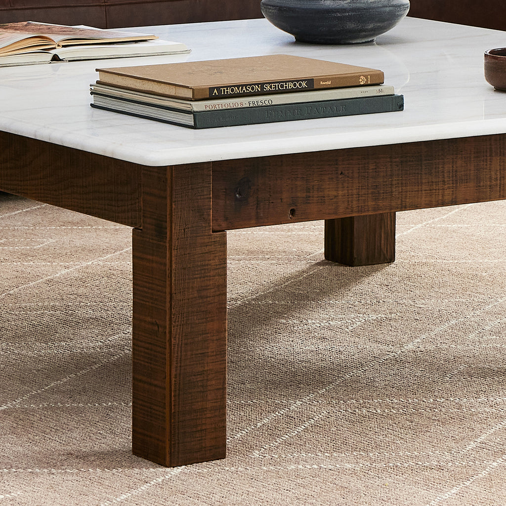 Inspired by an antique found at a flea market in Round Top, Texas, this Parsons-style coffee table is designed with a French primitive look. Marble top features subtle veining throughout and a soft ogee edge all around. Base is crafted of solid reclaimed pine with exposed joinery on the legs for a benchmade look and feel.