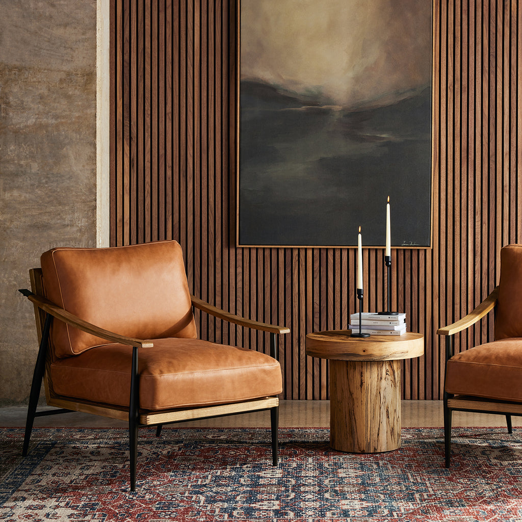 Comfort and class in one chic silhouette. Sloped wooden arms and forged legs frame create a striking great tonal balance between warm and cool.