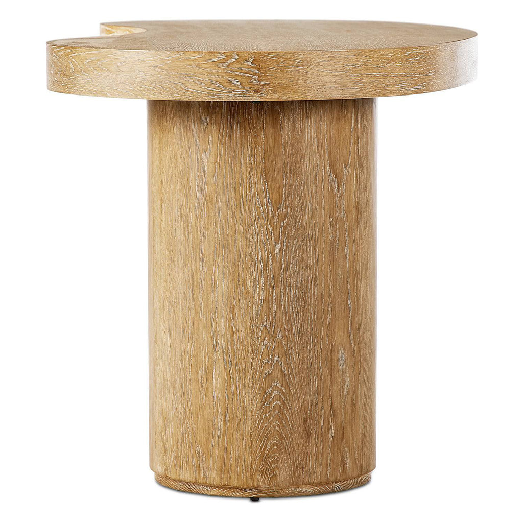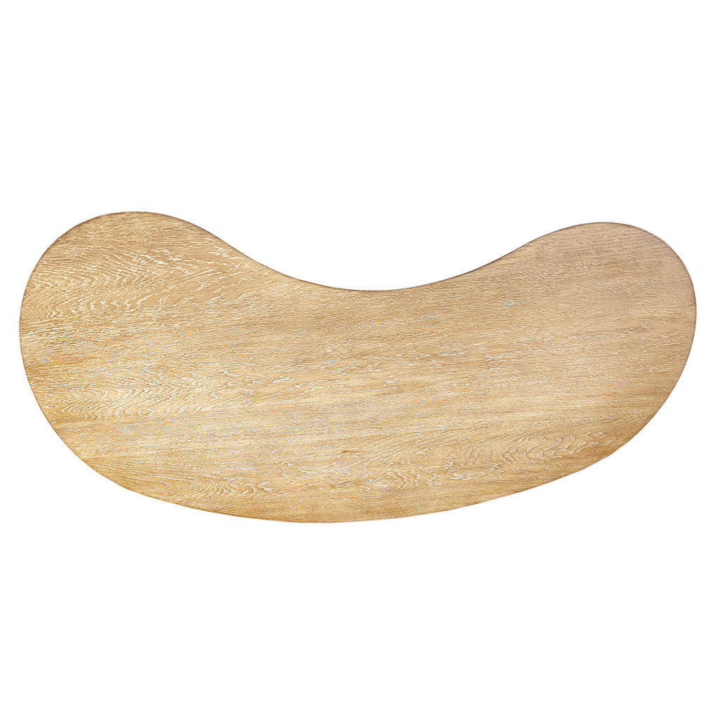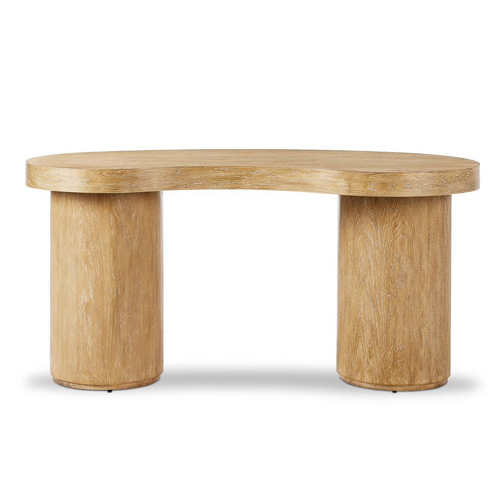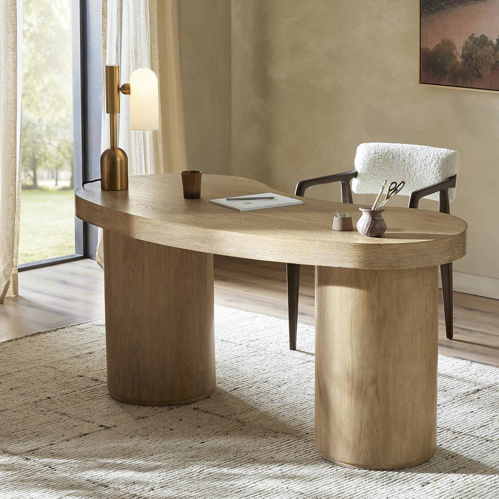 Substantial cylindrical legs support this kidney-shaped desk crafted in light blonde oak veneer — a testament to form harmonizing with function.