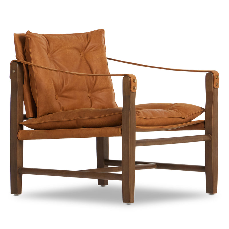 This material-driven take on safari styling features black heirloom leather. With a tufted sling-style seat, strap arm and pivot back, this vintage-feeling accent chair makes a chic statement wherever it's styled. Sourced from one of the oldest family-owned tanneries in Italy’s Bassano del Grappa, heirloom leather is salvaged and processed from upcycled hides featuring an abundance of natural markings, scars and color variations. The result? Beautifully supple, buttery soft hides with an unmatched depth of color and richness, and an authentic lived-in look.