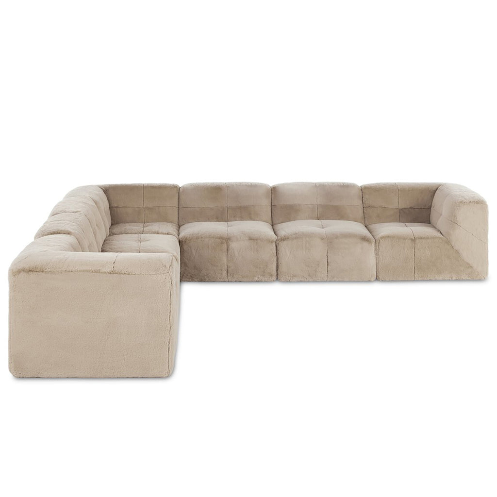Modularity at its best — and comfiest. Seven piece sectional covered in a plush fabric that's luxuriously soft to the touch.