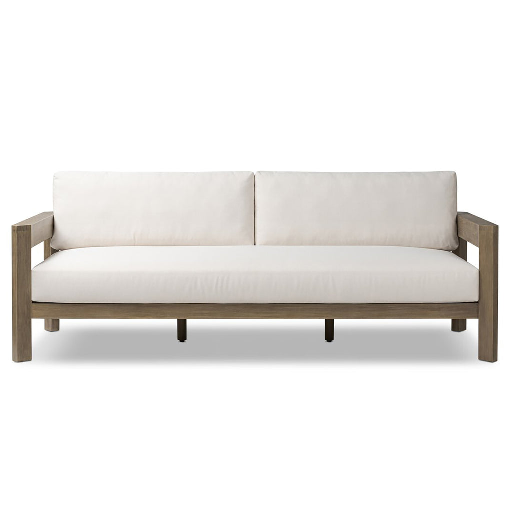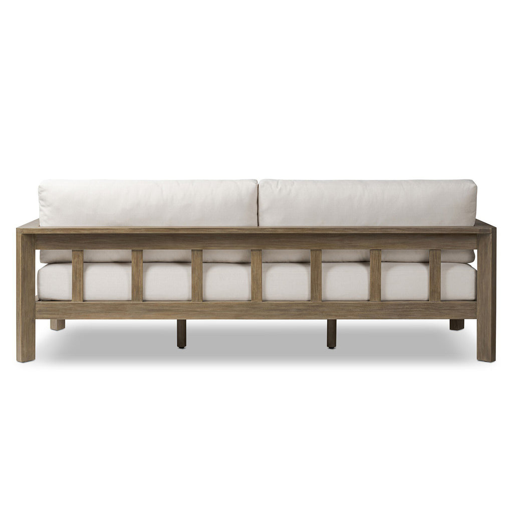 A clean, linear frame of FSC®-certified eucalyptus features chamfered detailing on both arms. Box seat and back cushions are upholstered in durable olefin. Cover or store indoors during inclement weather and when not in use.