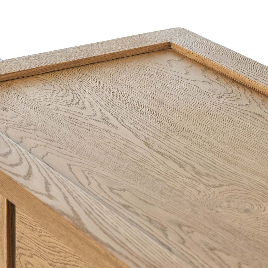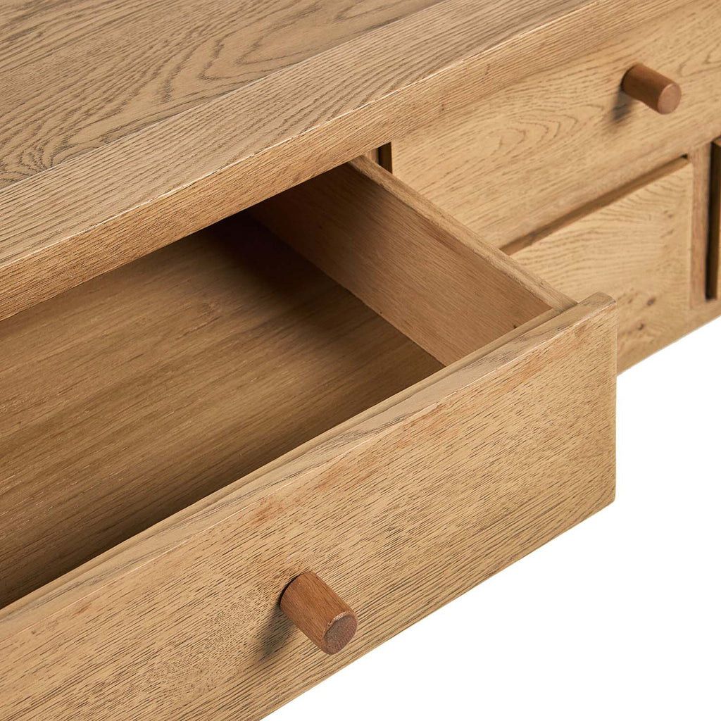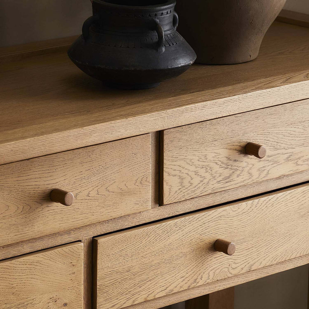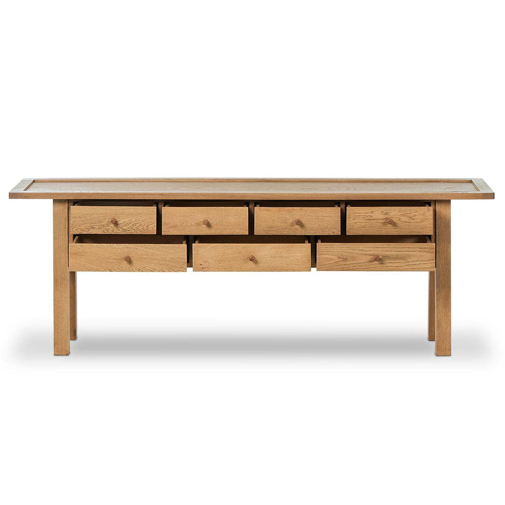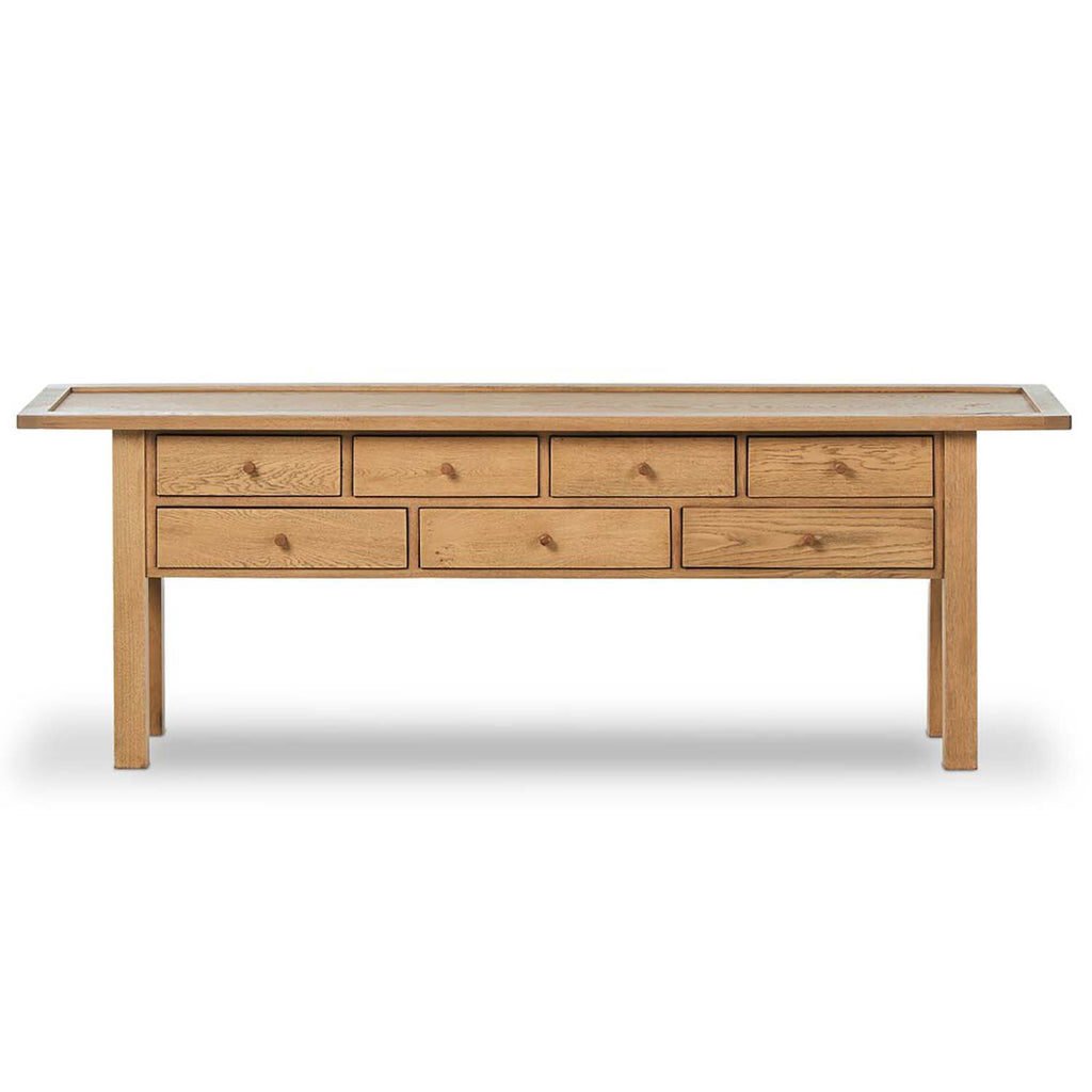 Inspired by a vintage general store counter, this console table features a heritage design with a modern twist. Thick oak legs with softened corners provide sturdy support, while oak knobs add a touch of classic charm. The inset tray top and varied drawer configuration offer ample storage.