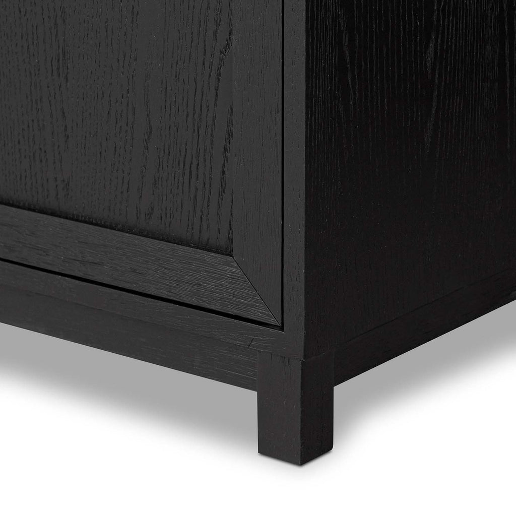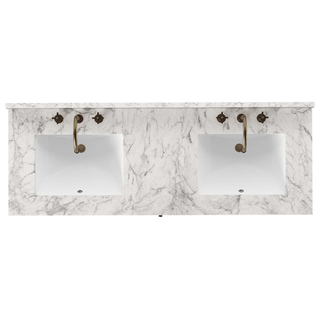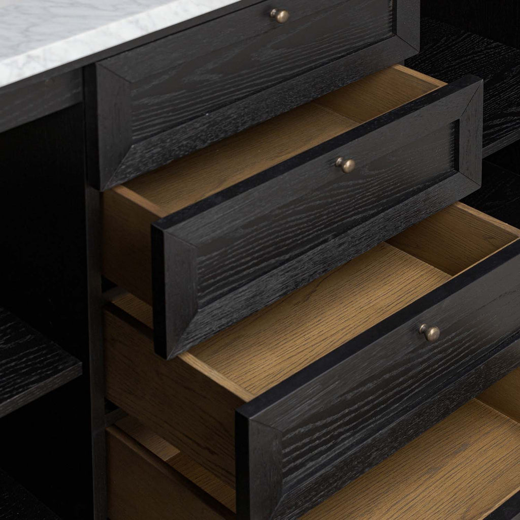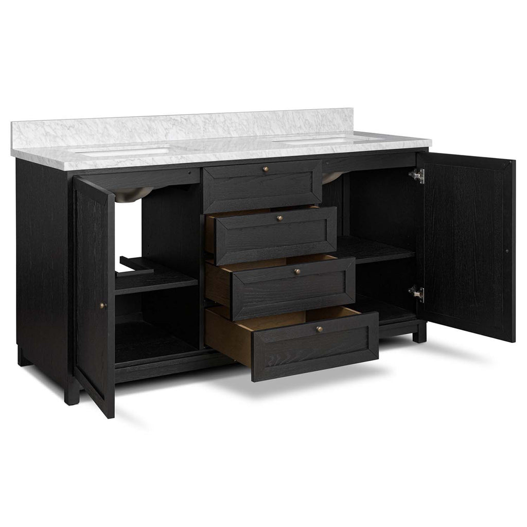 A sleek design built with tons of storage. Crafted with a thick oak veneer base in a satin black finish, a Carrera marble top and iron hardware in an antique bronze finish. A mix of drawers and cabinets offers plenty of storage. Drawers are fully finished in light natural oak; top drawer is not functional. Cabinets include removable shelves. Finished with a bath-safe sealant for moisture resistance. Designed to accommodate 8in-widespread faucets and standard-size hardware for easy customization; faucet shown not included. Sink and backsplash included; backsplash ships separately. Removable back with cutouts for plumbing; fits standard P-trap. Professional installation required.