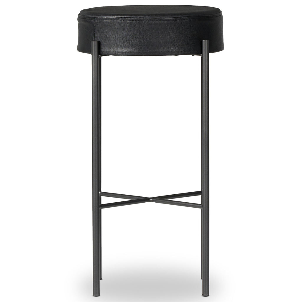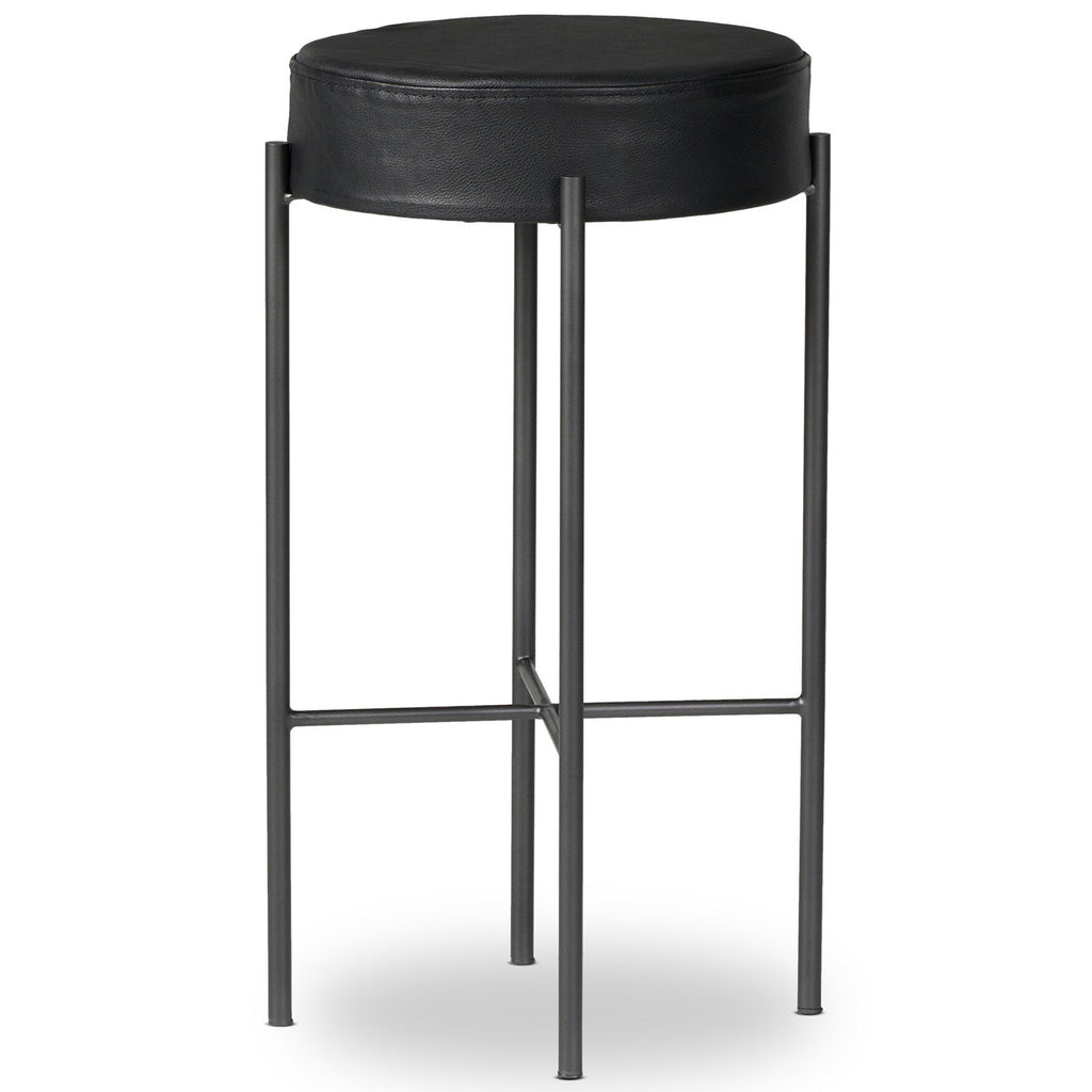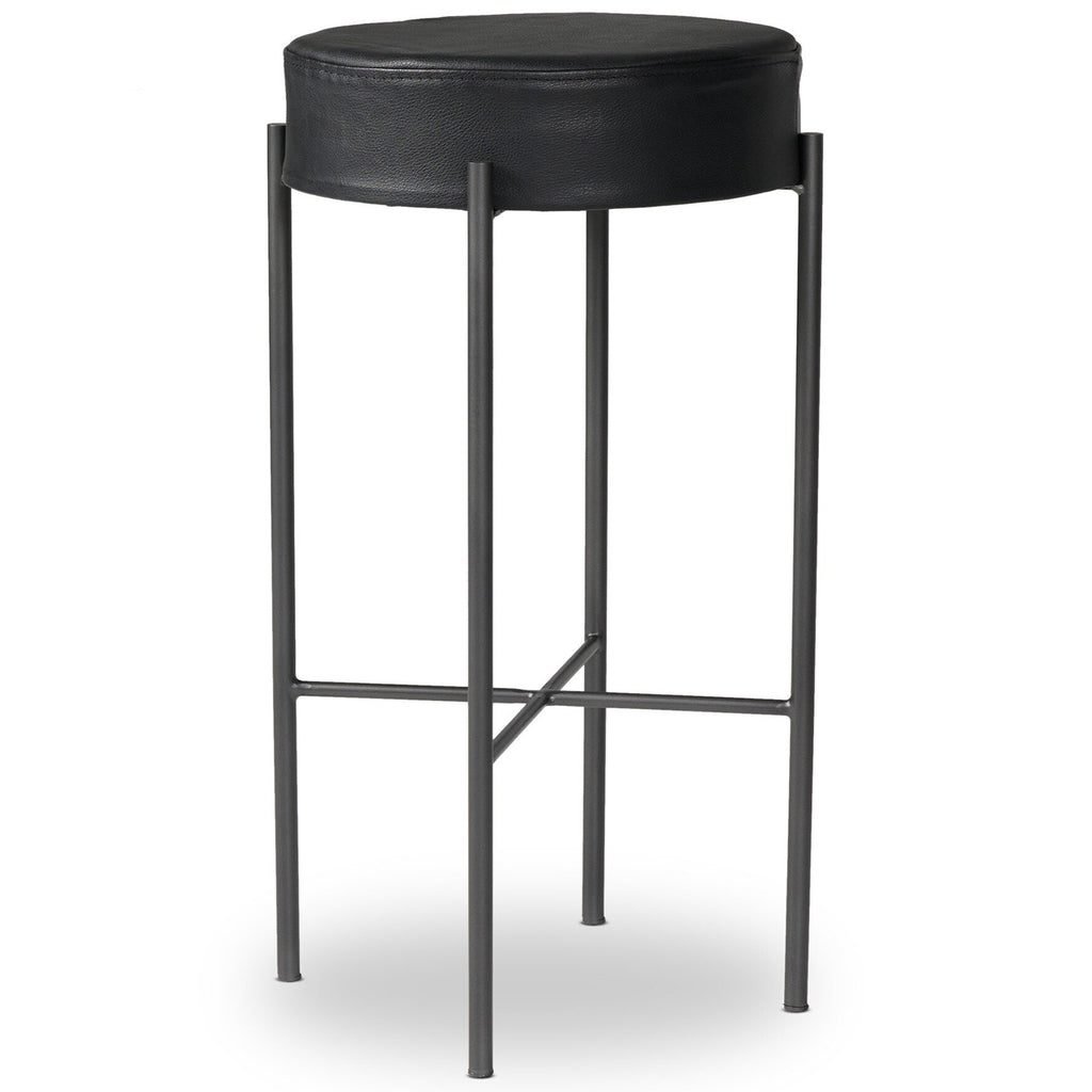 Slim and airy, gunmetal-finished iron legs form a cradle-style frame for speckled hide seating, perfectly sized for the bar. No two hides are the same. A variance in hide color, shape, pattern and hair length is to be expected, reflective of natural materials.