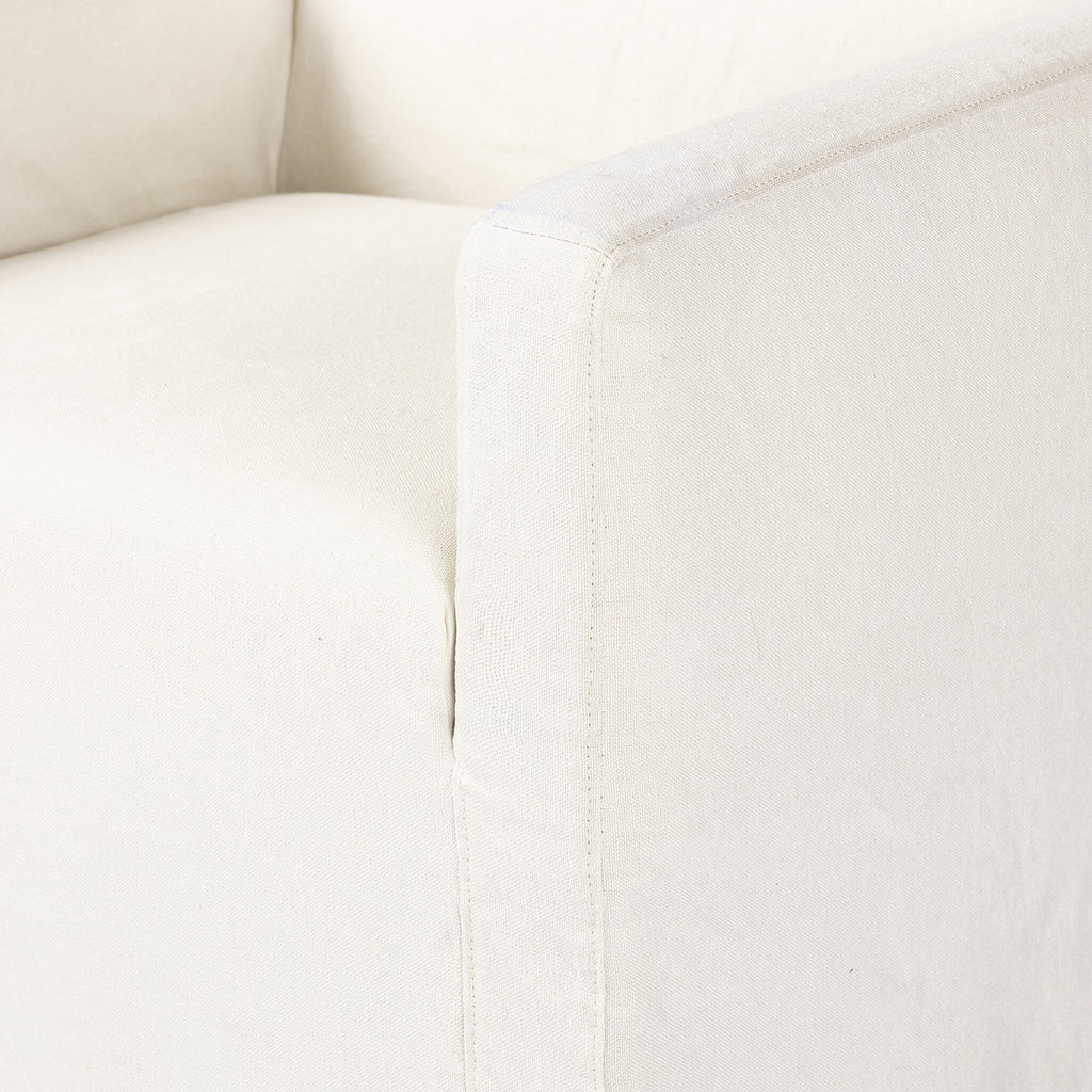 Slipcover style, updated. An outdoor dining chair with double box cushions and chunky scale, styled in washable and natural hemp upholstery that has a linen look and indoor-like slipcover drape. Cover or store inside during inclement weather and when not in use.
