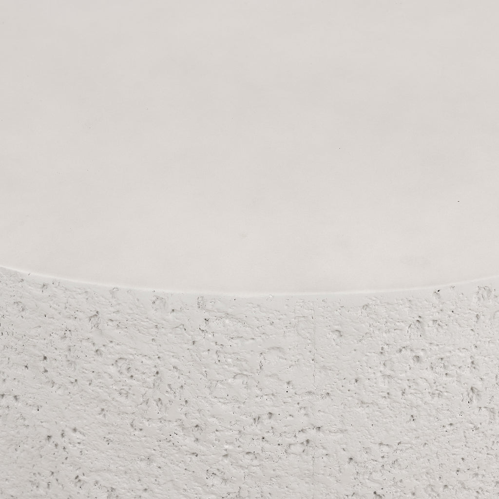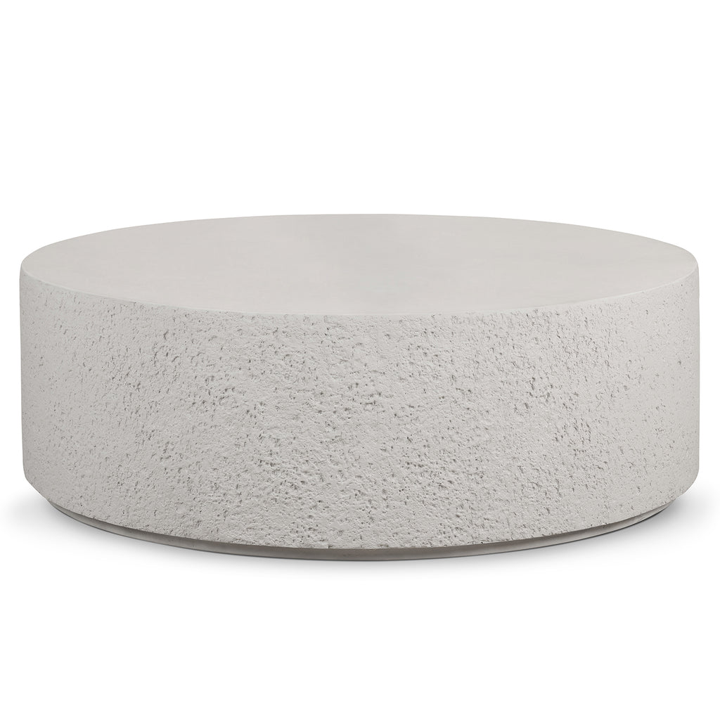 Bring a touch of industrialism to outdoor styling with this drum-style outdoor coffee table. Solid cream-colored concrete atop a plinth base features raw edging for texture, with a smooth, clean surface. Cover or store indoors during inclement weather and when not in use.