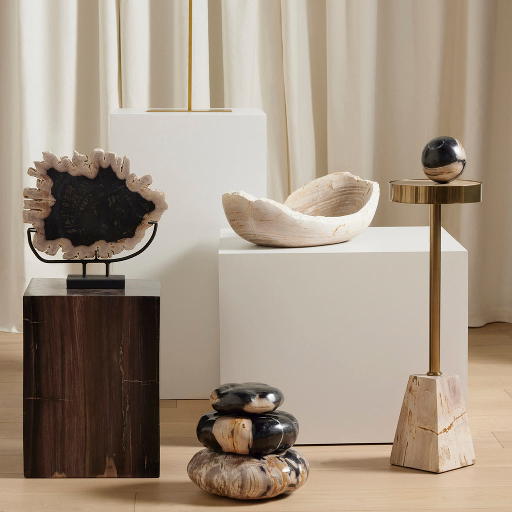 Made from petrified woods, a three-piece set of decorative balls can be styled just about anywhere.